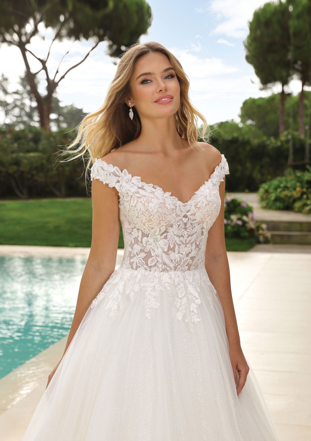 In perfetto stile principessa questo abito da sposa in tulle preziosamente ricamato con maniche scese che incrociano sensualmente le spalle, corpetto in pizzo e una morbida gonna in tulle che termina in un ampio strascico a cappella sapientemente ricamato con applicazioni di pizzo.