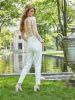 L'inaspettato look per il giorno del matrimonio. Quest’ abito presenta un delizioso corpetto trasparente con maniche lunghe effetto tattoo e un bellissimo pizzo floreale ricamato con perline di cristallo. I pantaloni slim in crêpe sono sapientemente realizzati per adattarsi al corpo e offrire un cenno elegante e moderno. Una sopragonna in tulle staccabile regala quel giusto tocco in più di romanticismo.