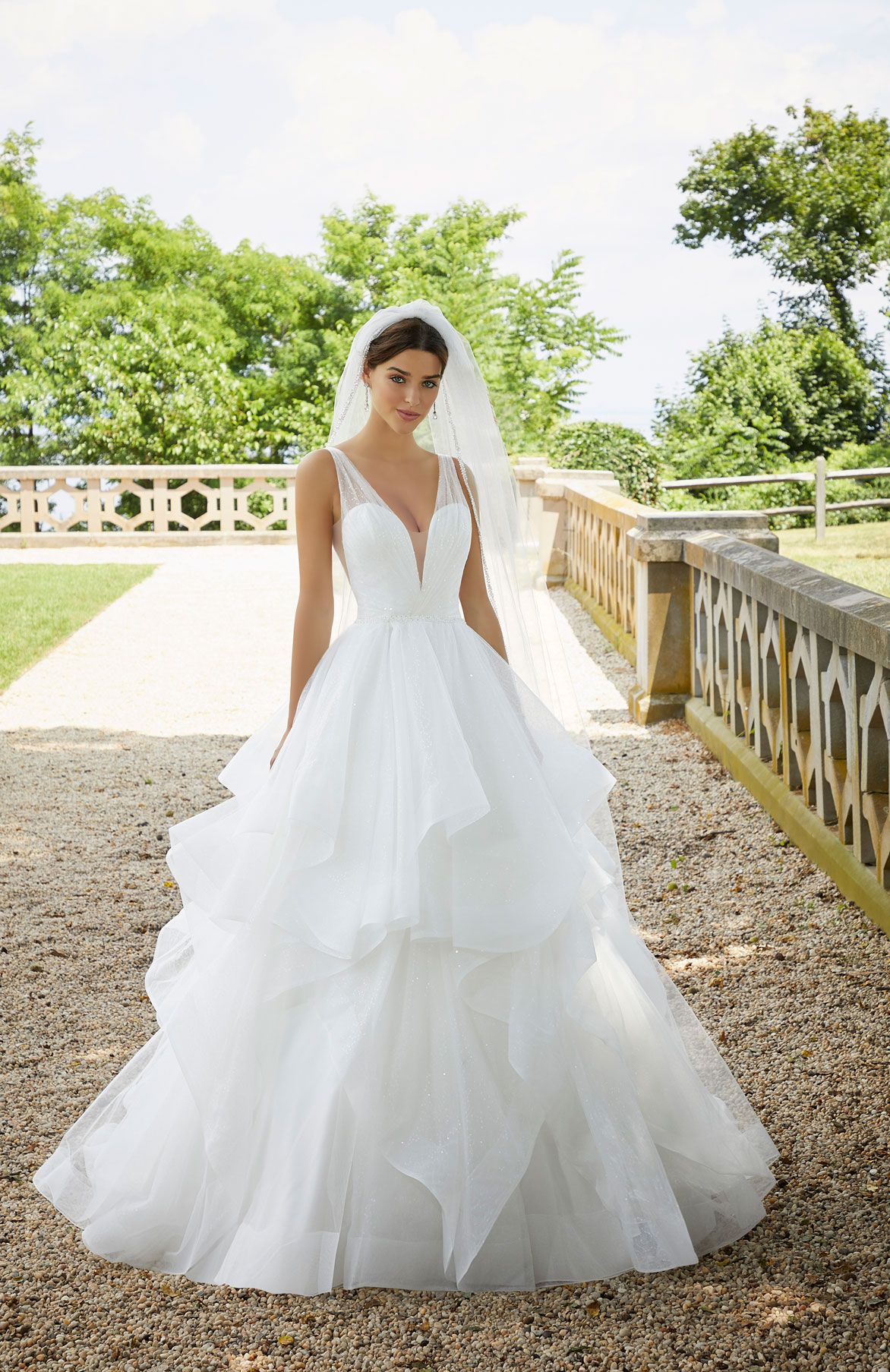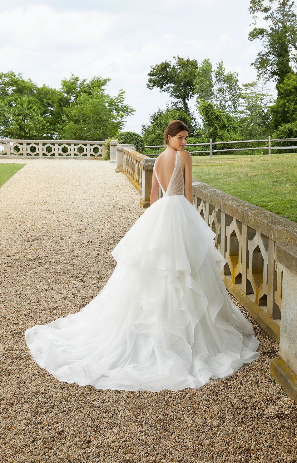 La cascata di balze di questo modello di abito da sposa aggiunge un tocco di delicato volume e femminilità ad una stupenda gonna in tulle glitterato, abbinata ad un corpetto con sensuale scollo a punta. Completa il look un delicato cinturino deliziosamente ricamato con perline e paillettes.