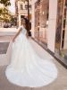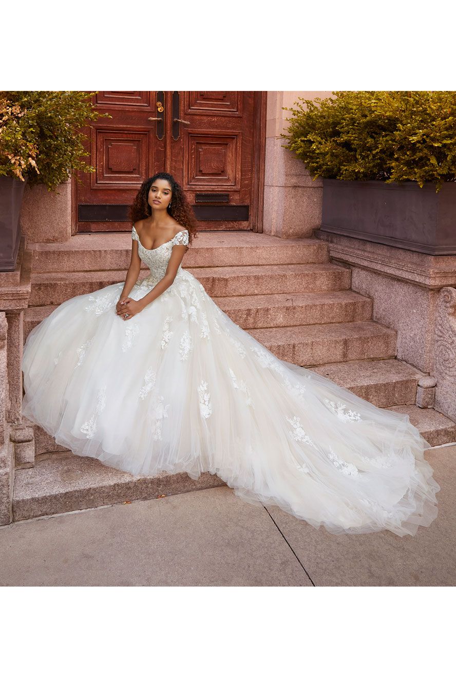 Un abito da sposa davvero romantico realizzato con ricchi ricami su una base di morbido tulle. Caratterizzato da moderno scollo a barchetta abbinato a una gonna a volume ampio è composta da strati di tulle in diverse finiture, che creano profondità e trasparenze. Un abito di cui sono fatti i sogni.