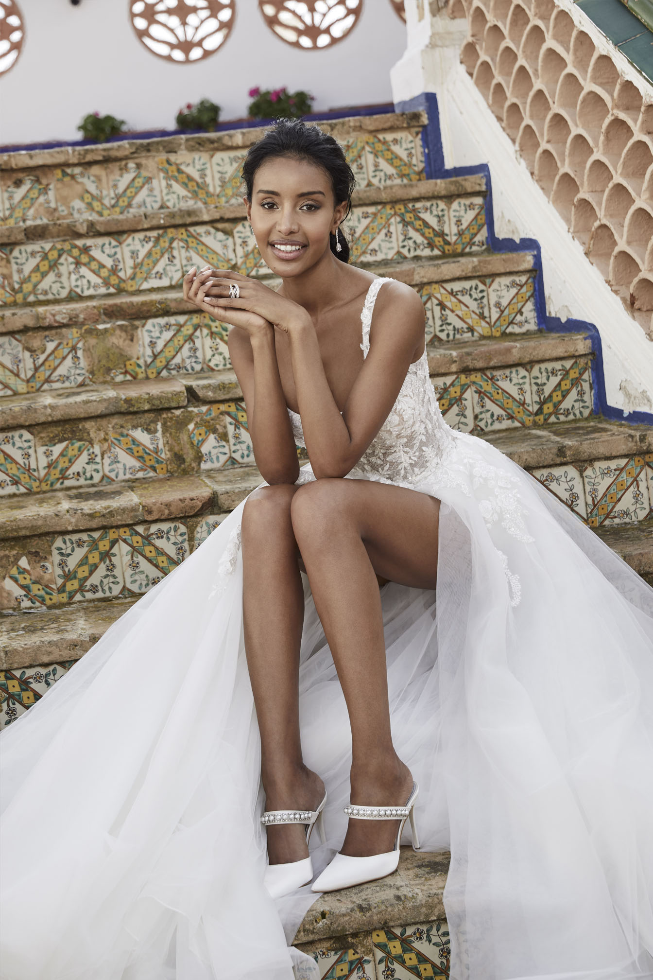 Il romanticismo del pizzo si esprime in tutta la sua meraviglia in questo stupendo abito da sposa a sirena con corpetto effetto bustier sapientemente lavorato con applicazioni floreali. Il modello è completato da sovragonna in tulle impalpabile rifinito da un delicato bordo in pizzo smerlato.