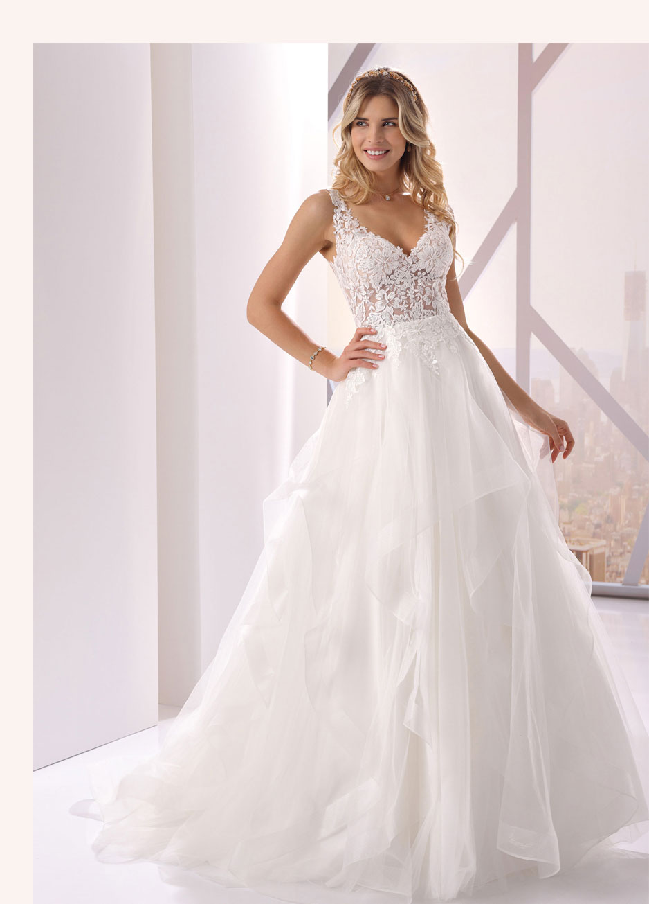 Il soffice tulle sovrapposto a balze regala una silhouette impalpabile a questo abito da sposa in stile principessa con una ricca gonna in movimento. Il corpetto arricchito da decorazioni in pizzo è completato da una profonda scollatura a V e inserti semitrasparenti.