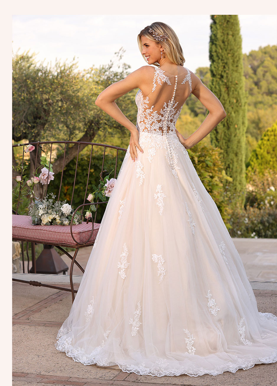 Il romanticismo del pizzo si esprime in tutta la sua meraviglia in questo stupendo abito da sposa, con corpino trasparente, delicate spalline in pizzo che creano lo scollo a "V". Il pizzo è assoluto protagonista anche sulla schiena dove crea un splendido effetto tattoo e sulla gonna in tulle che sfocia in un piccolo strascico a cappella.
