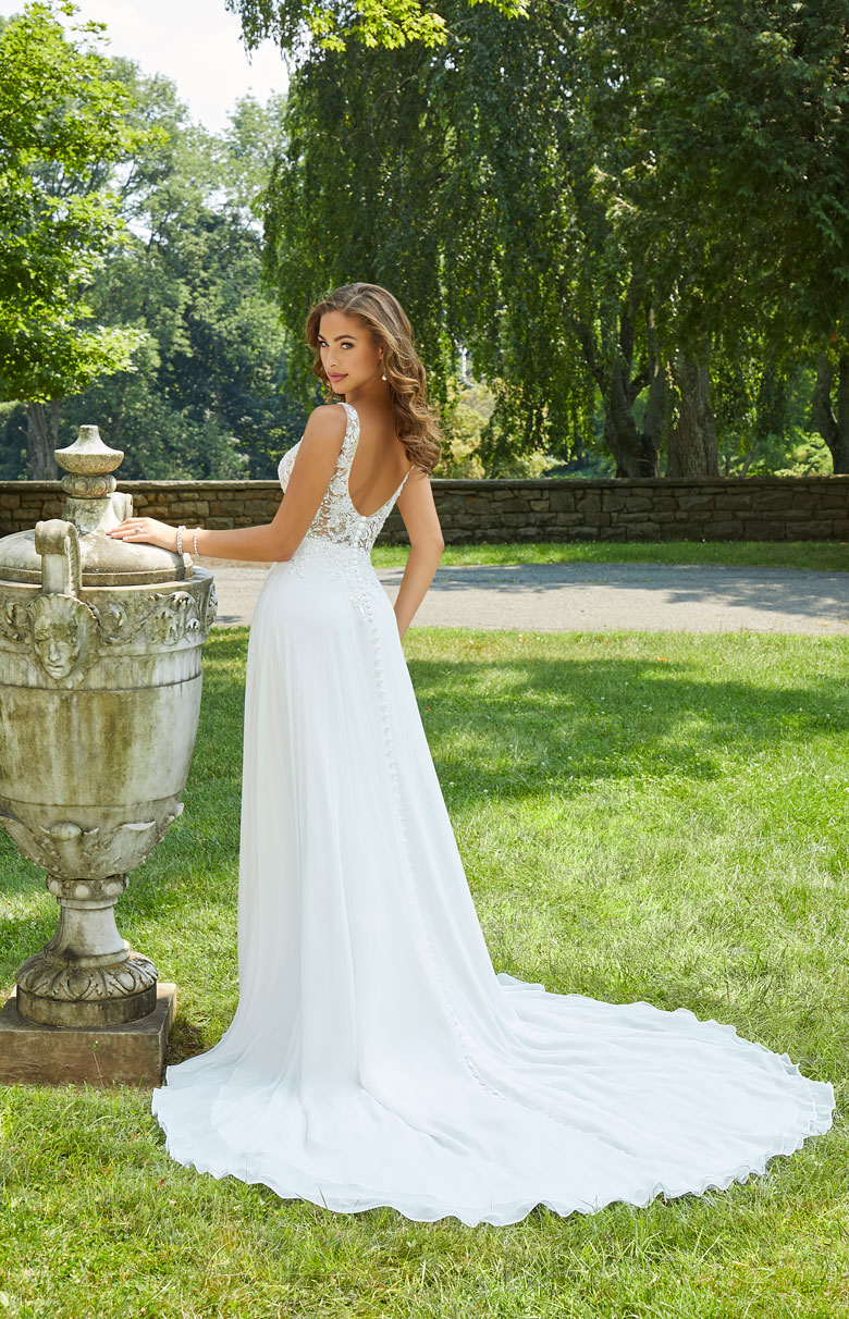 Meraviglioso abito da sposa realizzato in fluente chiffon. Un modello che combina la leggerezza della gonna con la sensualità delle trasparenze del corpetto decorato con abbaglianti ricami di perline di cristallo e sottili bretelle in pizzo che conferiscono alla schiena una giocosa e sensuale scollatura. Completa il look un profondo spacco sulla gonna con seducente effetto peek-a-boo. |