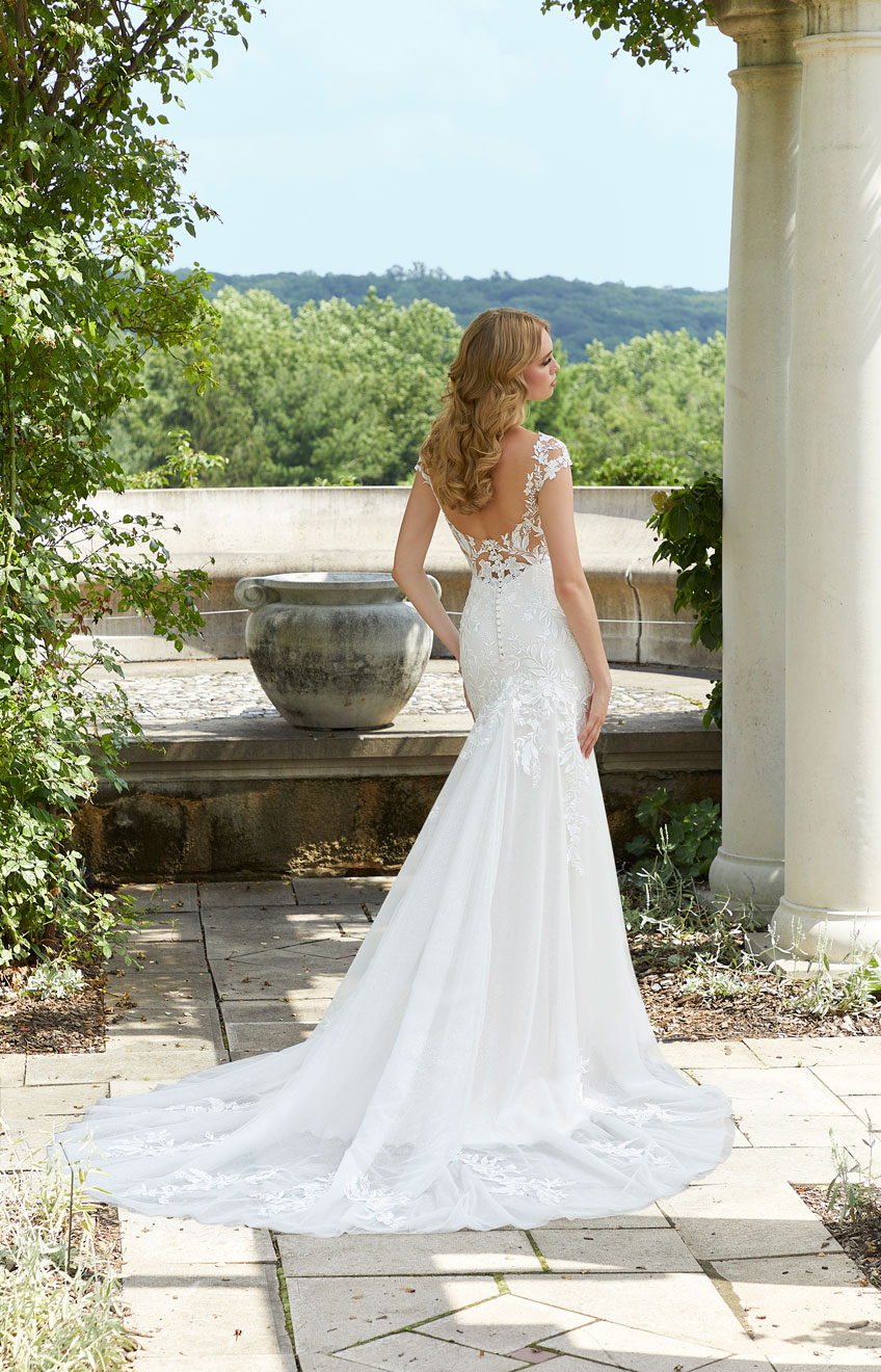 Il nostro abito da sposa è ciò di cui sono fatti i sogni da sposa. Questo elegante modello presenta una scollatura a barchetta trasparente con delicate manichine ad aletta, il tutto ricoperto di pizzo ricamato di ispirazione floreale e tulle scintillante progettato per brillare da tutte le angolazioni. La morbida silhouette metterà in risalto le curve e la schiena aperta e trasparente è più che sensuale.