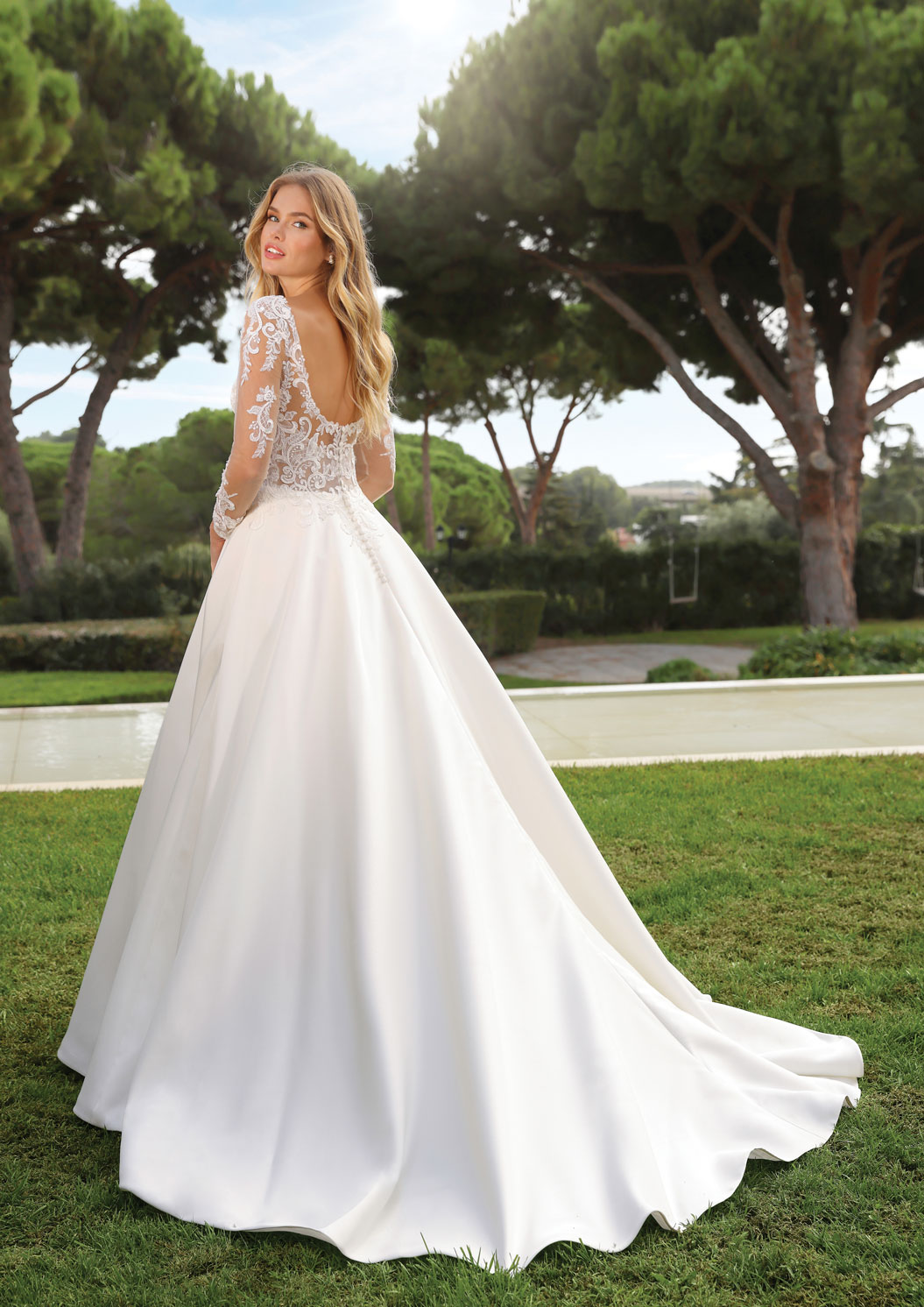 Questo abito da sposa ha un delicato fascino vintage. La splendida vestibilità e la silhouette a sirena sono caratterizzati da un raffinato pizzo macramè che crea sulle spalle un delicato effetto barchetta. Il pizzo è assolutamente protagonista sia sulla schiena che sulle maniche dove crea uno splendido effetto tattoo. |