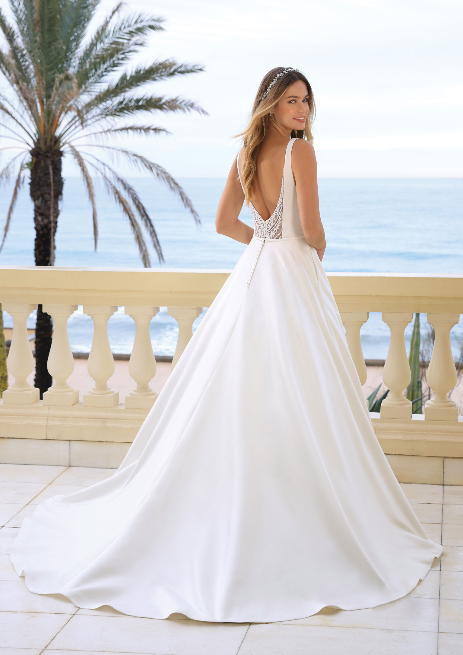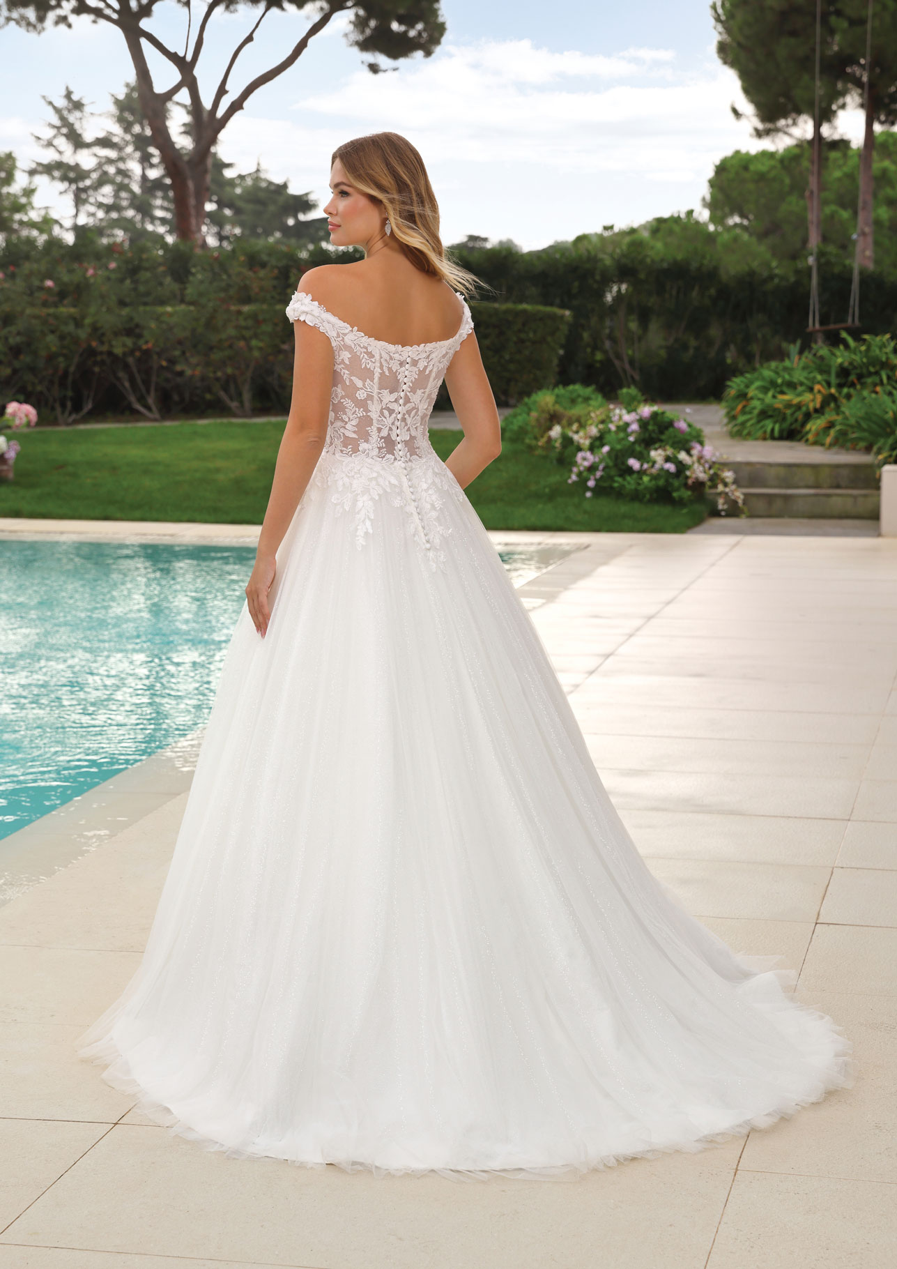 Abito da sposa dalle linee impalpabili in morbido chiffon. Il meraviglioso effetto tattoo sulla schiena rende allo stesso tempo sensuale e romantico questo abito. Completa il look un sofisticato scollo all’americana che incornicia e mette magnificamente in risalto le spalle.