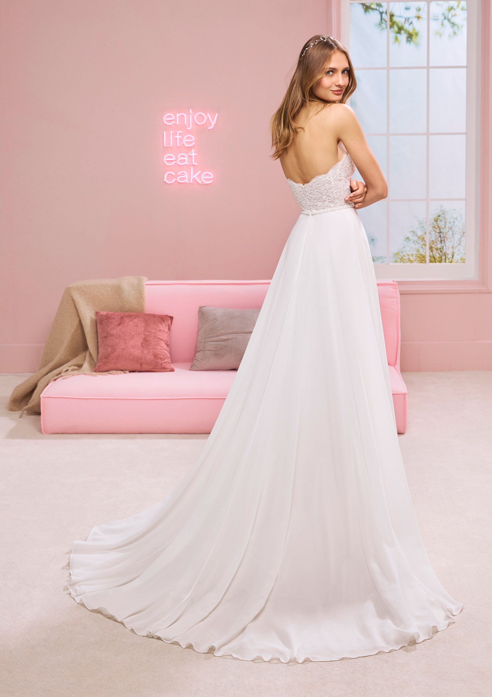 Questo splendido abito da sposa è seducente e raffinato allo stesso tempo. Combina una sensuale scollatura a V, un corpetto impreziosito da un lussuoso pizzo floreale, romantiche maniche a sbuffo e una fluente gonna in chiffon leggermente arricciato per creare un look unico nel suo genere.