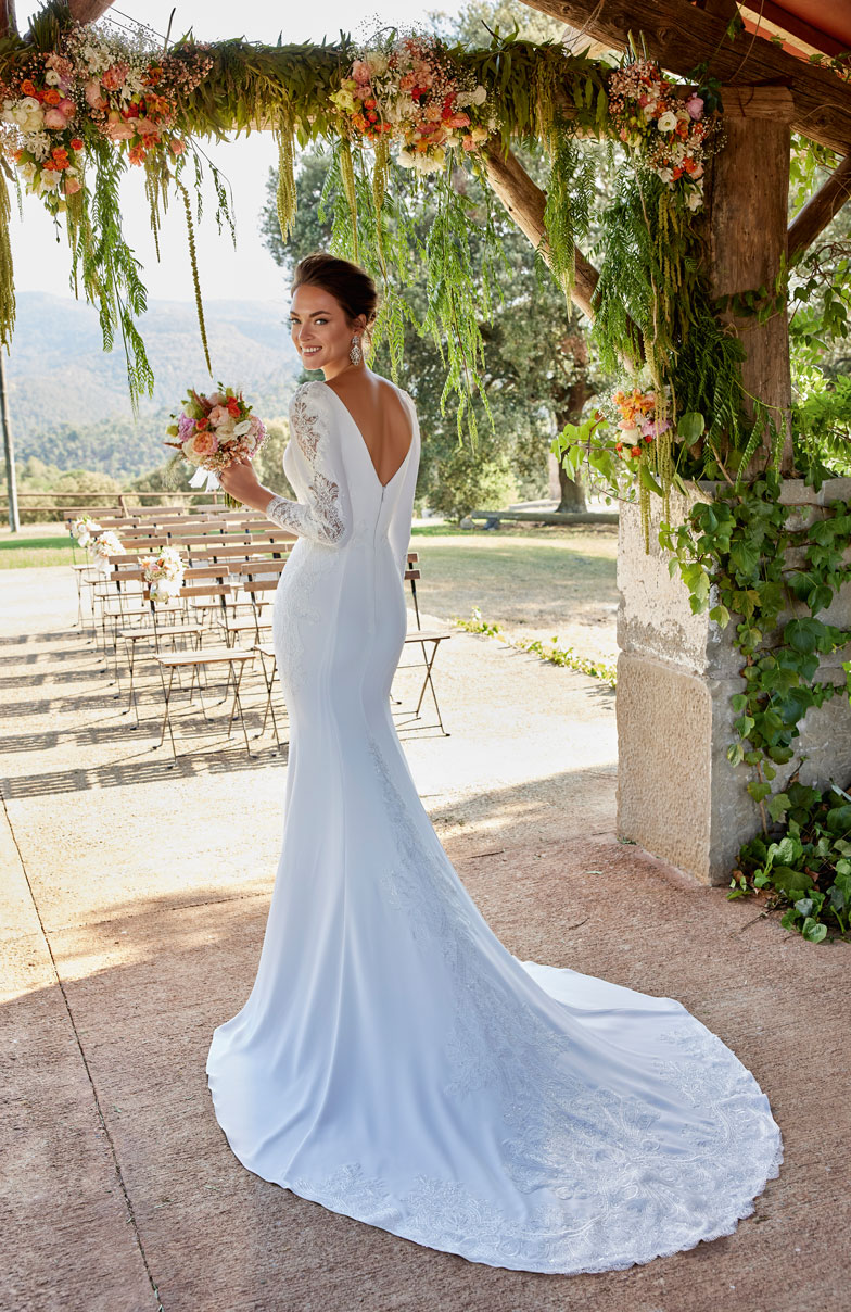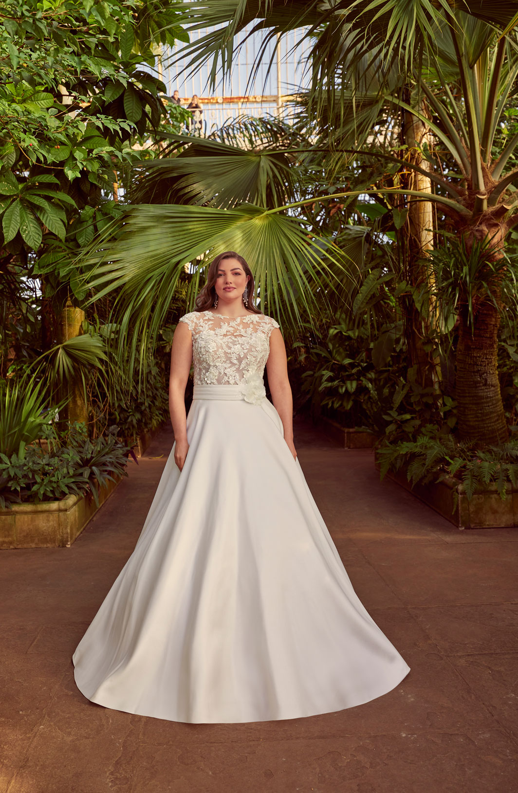 Magnifico abito da sposa stile principessa con dettagli moderni dallo stile unico. La gonna in Mikado off-white a strati di grandi dimensioni si apre in uno strascico a cattedrale. Il corpetto è caratterizzato da collo alto, maniche ad aletta in pizzo. La vita è sottolineata da una fascia pieghettata, rifinita con un fiore 3D glitterato.