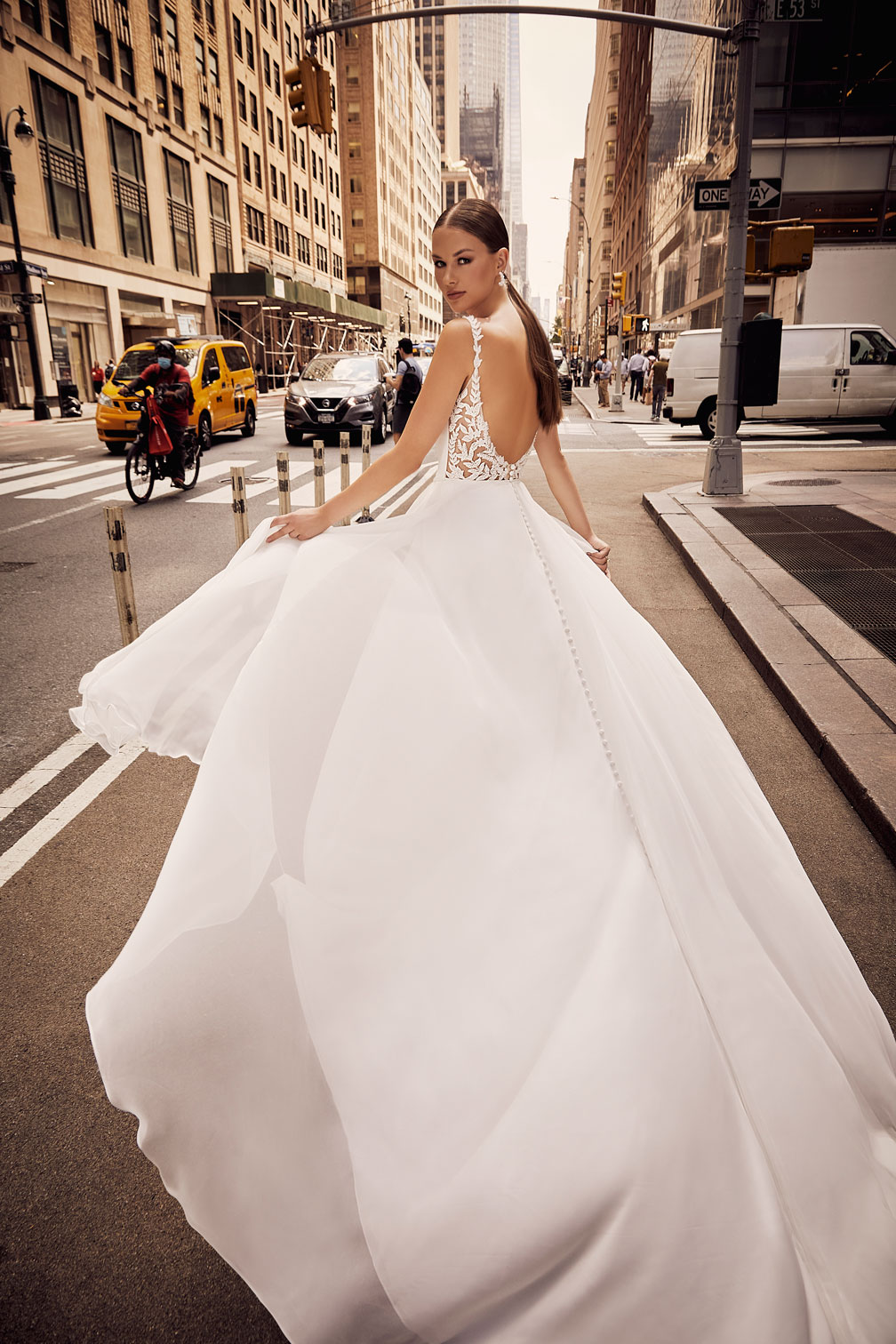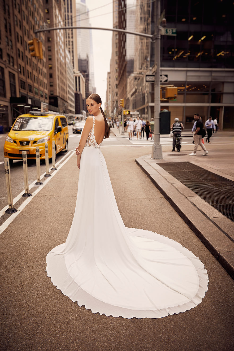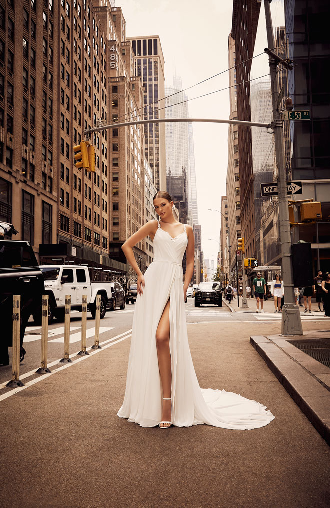 Abito svasato dalle linee impalpabili in morbido chiffon che si muove leggero, abbinato a un corpetto con sottili bretelline in pizzo, semplici decorazioni floreali e raffinata apertura sulla schiena. Un elegante strascico e un civettuolo spacco donano all’abito un look di assoluta tendenza.