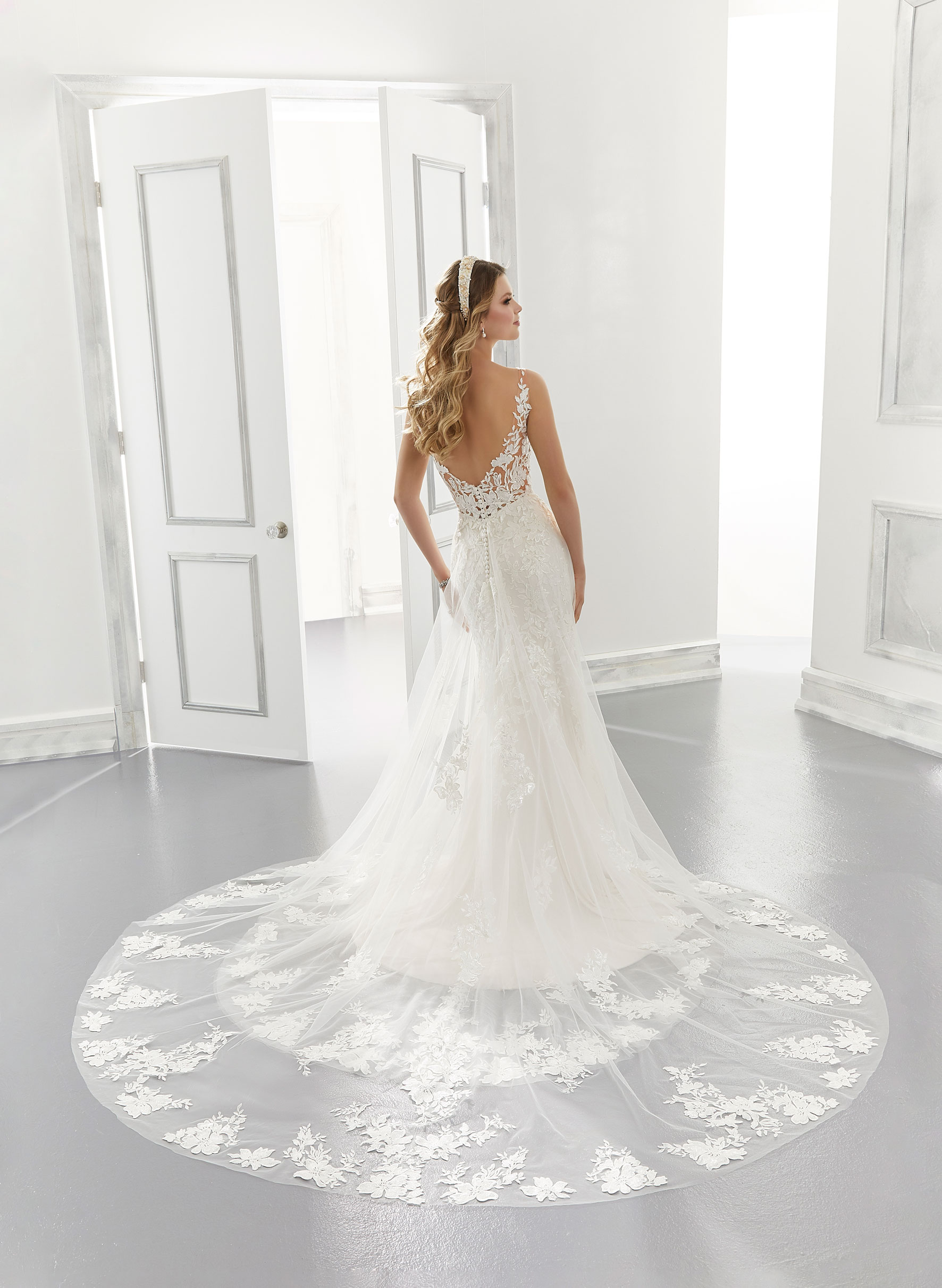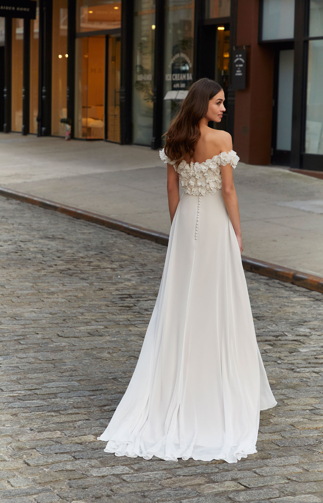 Un sofisticato scollo all'americana completa un classico abito da sposa scivolato in chiffon con un sensuale spacco frontale. Decori di perline di cristallo, una fila di bottoncini e spalline geometriche incorniciano e mettono magnificamente in risalto le spalle.