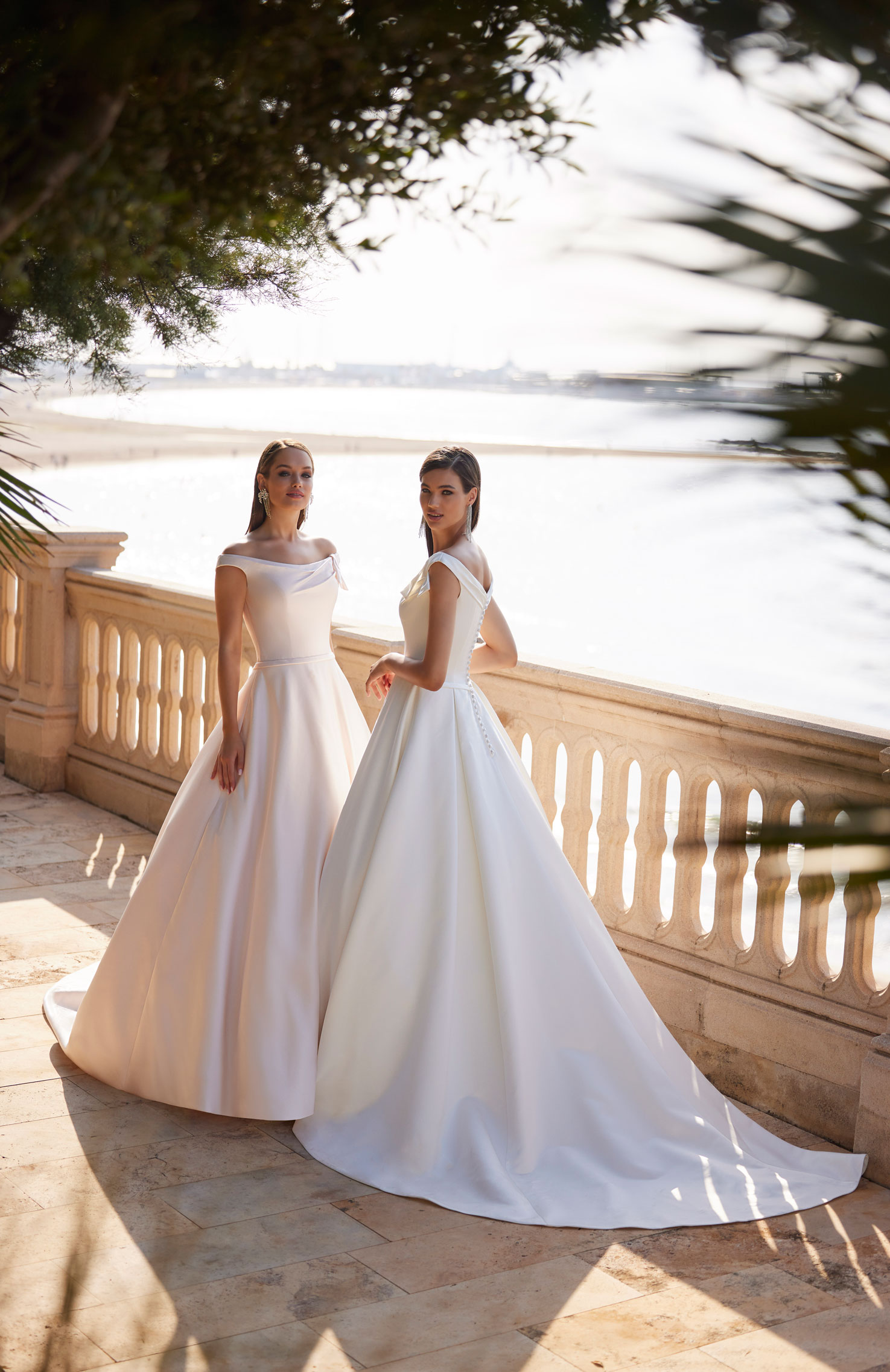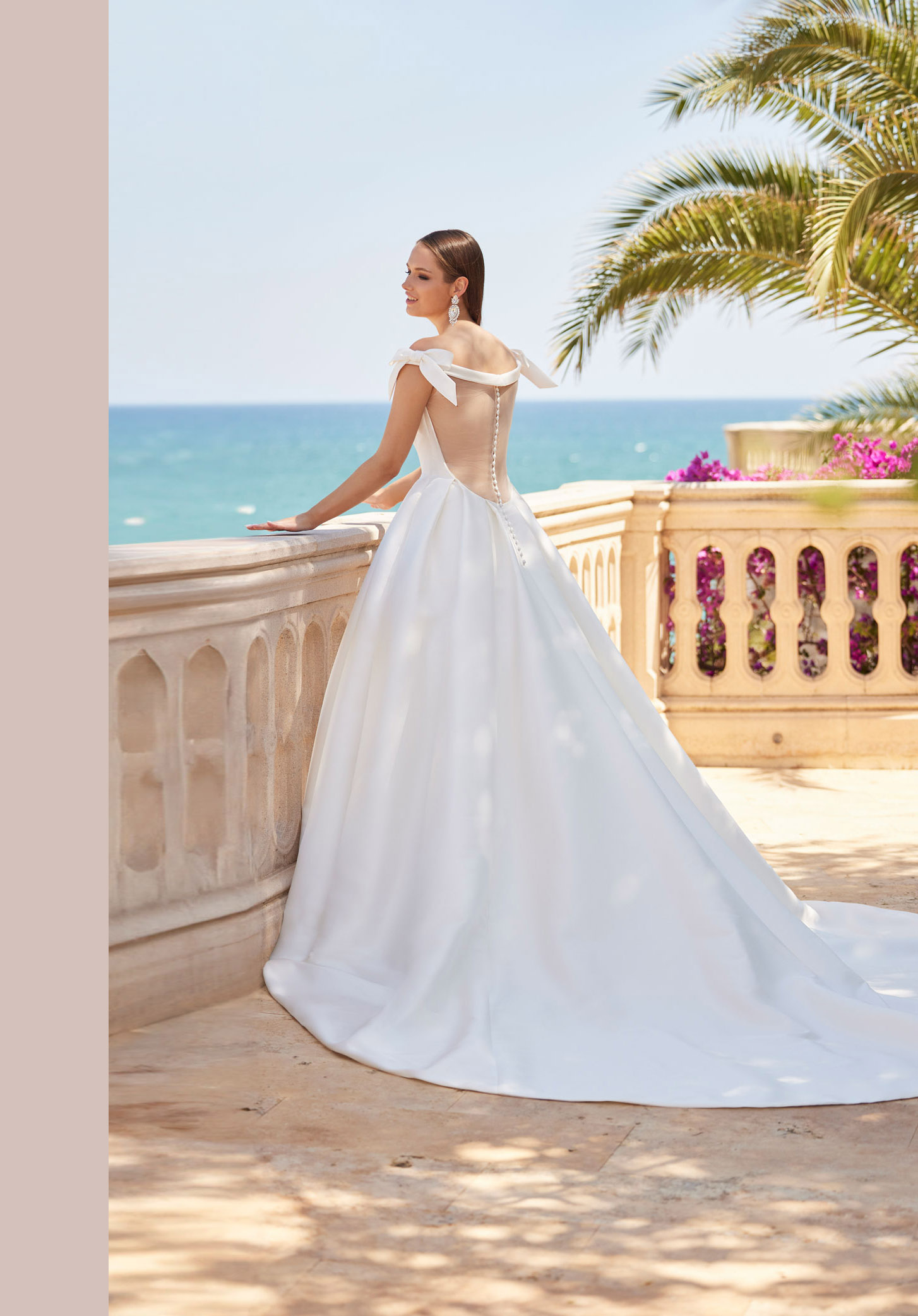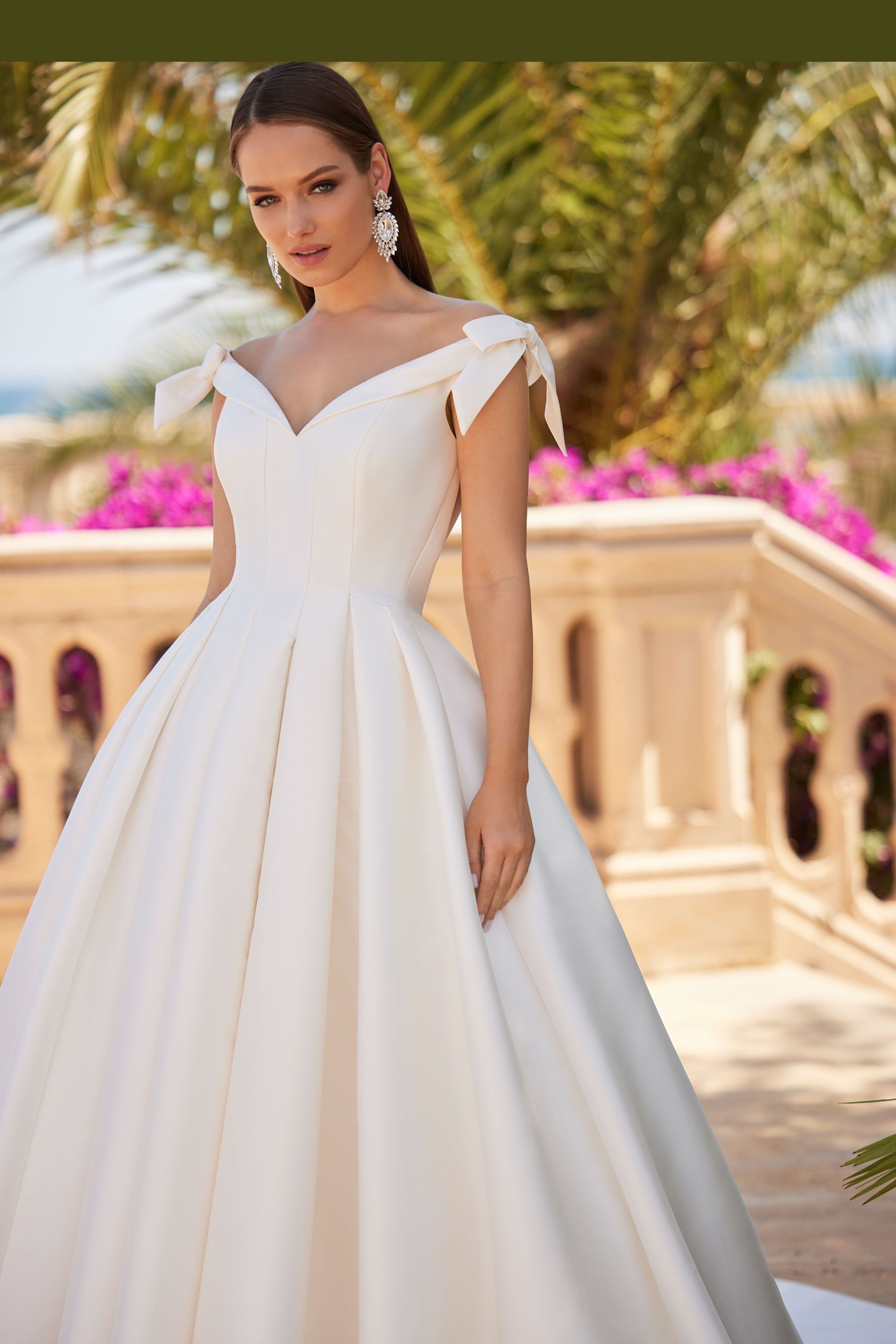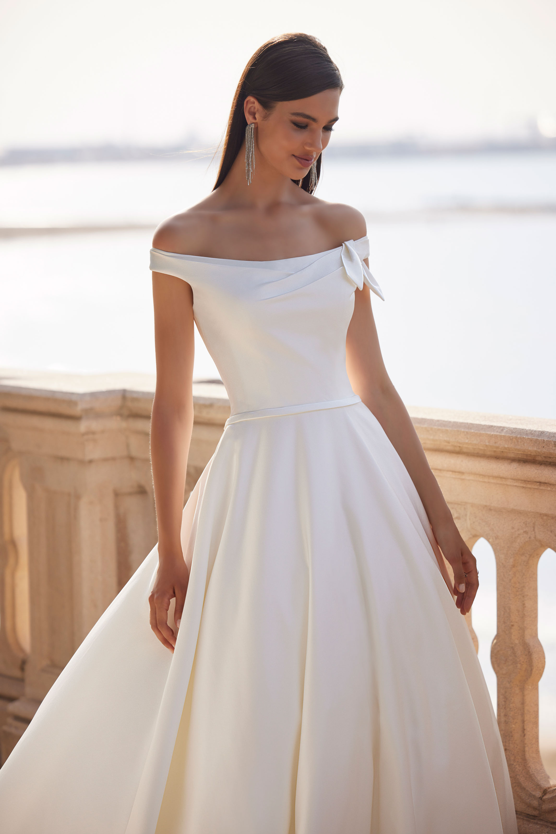 Splendido abito da sposa dalla personalità decisa con linee minimal, confezionato in mikado con ampia gonna a campana. Completano il look un sofisticato scollo all'americana decorato con cristalli luminosi, un fiocchetto a vita e una deliziosa fila di bottoncini che decora con grazia tutta la gonna fino allo strascico a cappella.