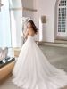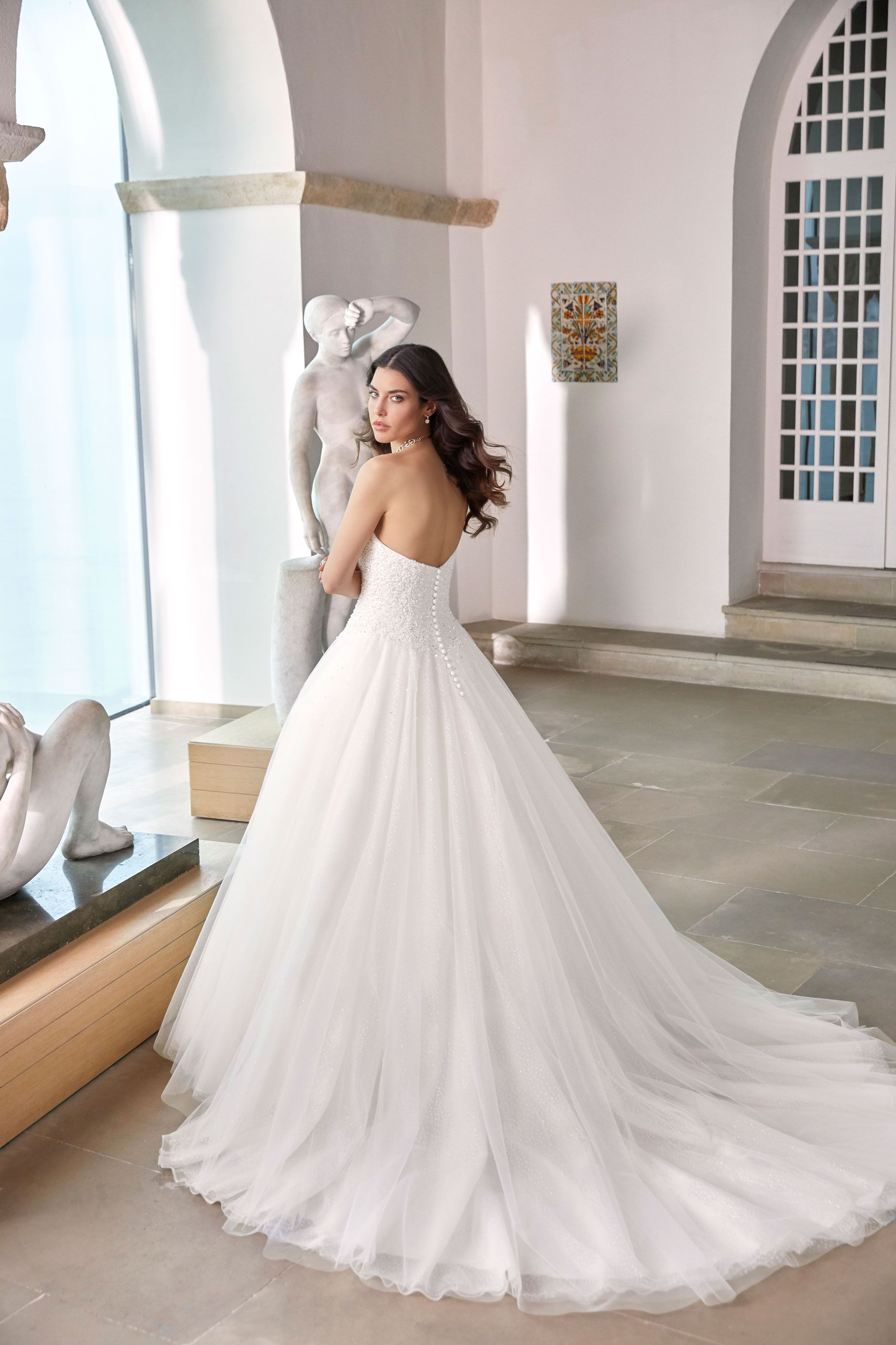 Questo sorprendente abito da sposa in stile principessa presenta un corpetto tempestato di cristalli luminosi e perle su una voluminosa gonna in morbido tulle e glitter che creano uno straordinario effetto brillante. Una delicata scollatura a cuore completa il look.