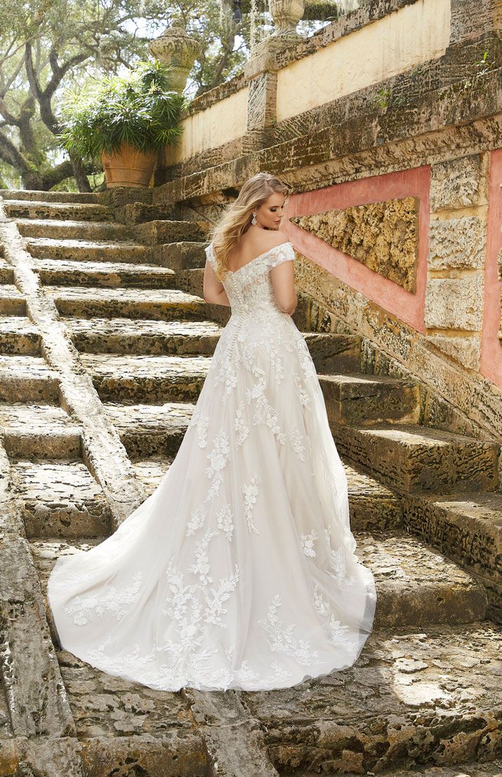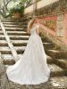 In perfetto stile principessa questo abito da sposa in tulle preziosamente ricamato con maniche scese che incrociano sensualmente le spalle. Il corpetto in pizzo e una morbida gonna in tulle che termina in un ampio strascico a cappella sapientemente ricamato con applicazioni di pizzo completano il look.