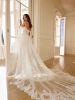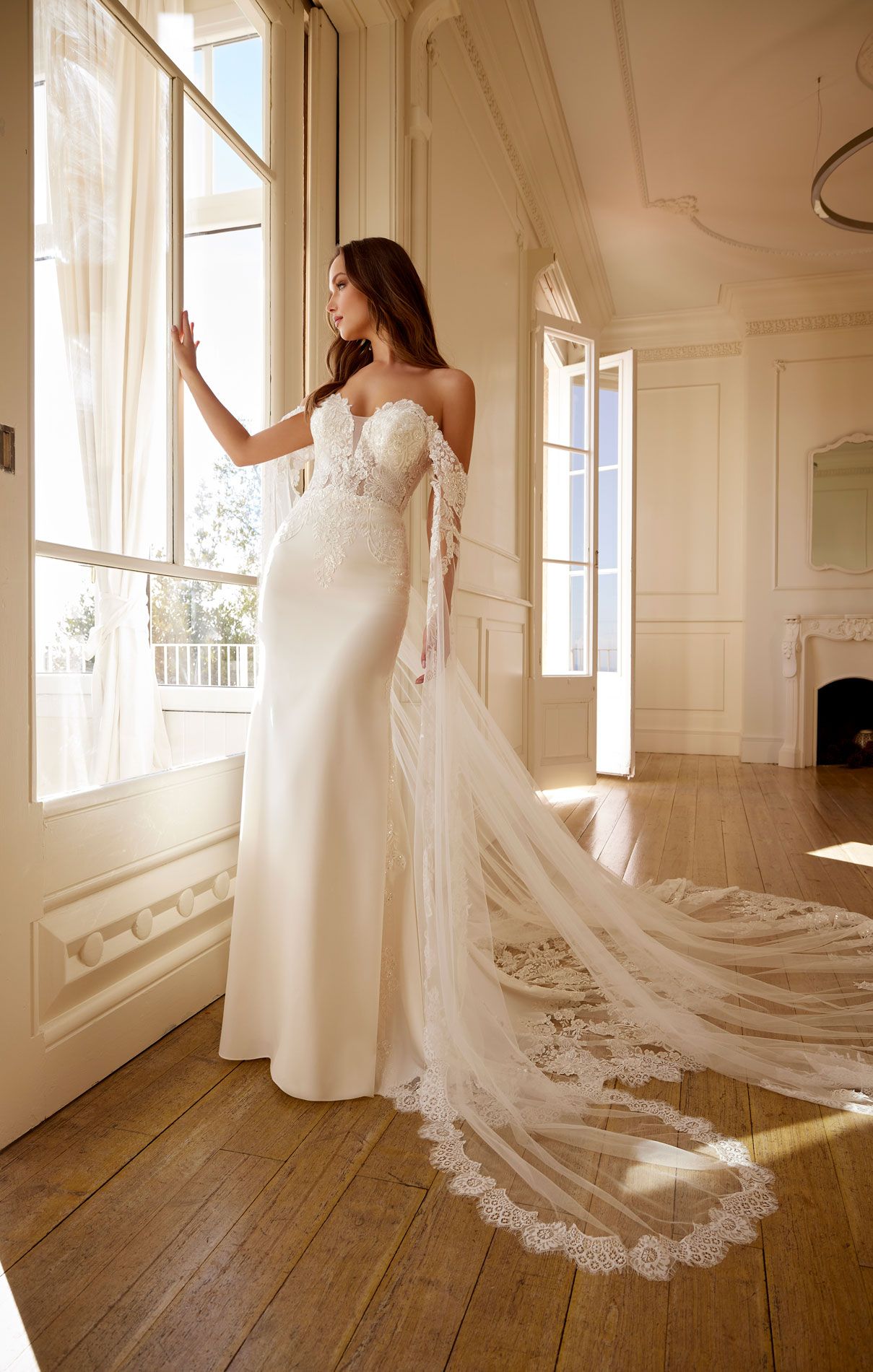 Questo abito da sposa dalla linea sirena, di ispirazione boho, è realizzato in crêpe ed è ornato da ricami floreali. Lo scollo frontale e la schiena estremamente sensuali sono formati da tulle e pizzo semi-trasparenti in stile corsetto, bottoncini e fiori 3D. Anche lo spettacolare strascico staccabile e le maniche a mantella a tutta lunghezza sono caratterizzato da ricami floreali.