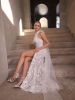 Pensato per farsi notare, questo abito a sirena combina un collo all’americana con una schiena scoperta che aggiunge freschezza e sensualità. Le applicazioni floreali in pizzo su tulle creano una texture ricca e avvolgente, perfetta per una celebrazione elegante e moderna. Completano il look un profondo spacco e maniche in pizzo staccabili.