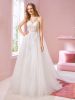 Questo elegante abito da sposa dalla linea a trapezio è caratterizzato da uno scollo trasparente che crea un gradevole effetto collana con motivi floreali che delineano il decolletè, le spalline e lo scollo a cuore, terminando su un mantello scintillante su una soffice gonna in tulle.
