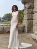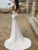 Questo sofisticato abito da sposa in raso di seta, dalla vestibilità aderente, presenta un elegante scollo a barca, una sensuale schiena scoperta e un cinturino con motivo floreale 3D