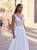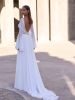 Questo raffinatissimo modello di abito da sposa in chiffon a trapezio è caratterizzato da un corpetto trasparente con scollo a V, applicazioni di paillettes e perline, schiena bassa e maniche a campana staccabili.