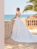 Un romantico abito da sposa da favola con delicati fiocchetti che incorniciano le spalle scoperte. Caratterizzato da una moderna schiena trasparente con bottoni rivestiti in tessuto, questo intramontabile abito in mikado è perfetto per una sposa tradizionale.