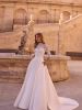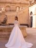 Questo abito principessa con maniche a tre quarti e scollo a cigno unisce struttura e romanticismo. Il corpetto semitrasparente in pizzo si fonde con una gonna voluminosa in morbido raso, creando una silhouette maestosa con dettagli che brillano delicatamente grazie alle delicatissime perline.
