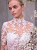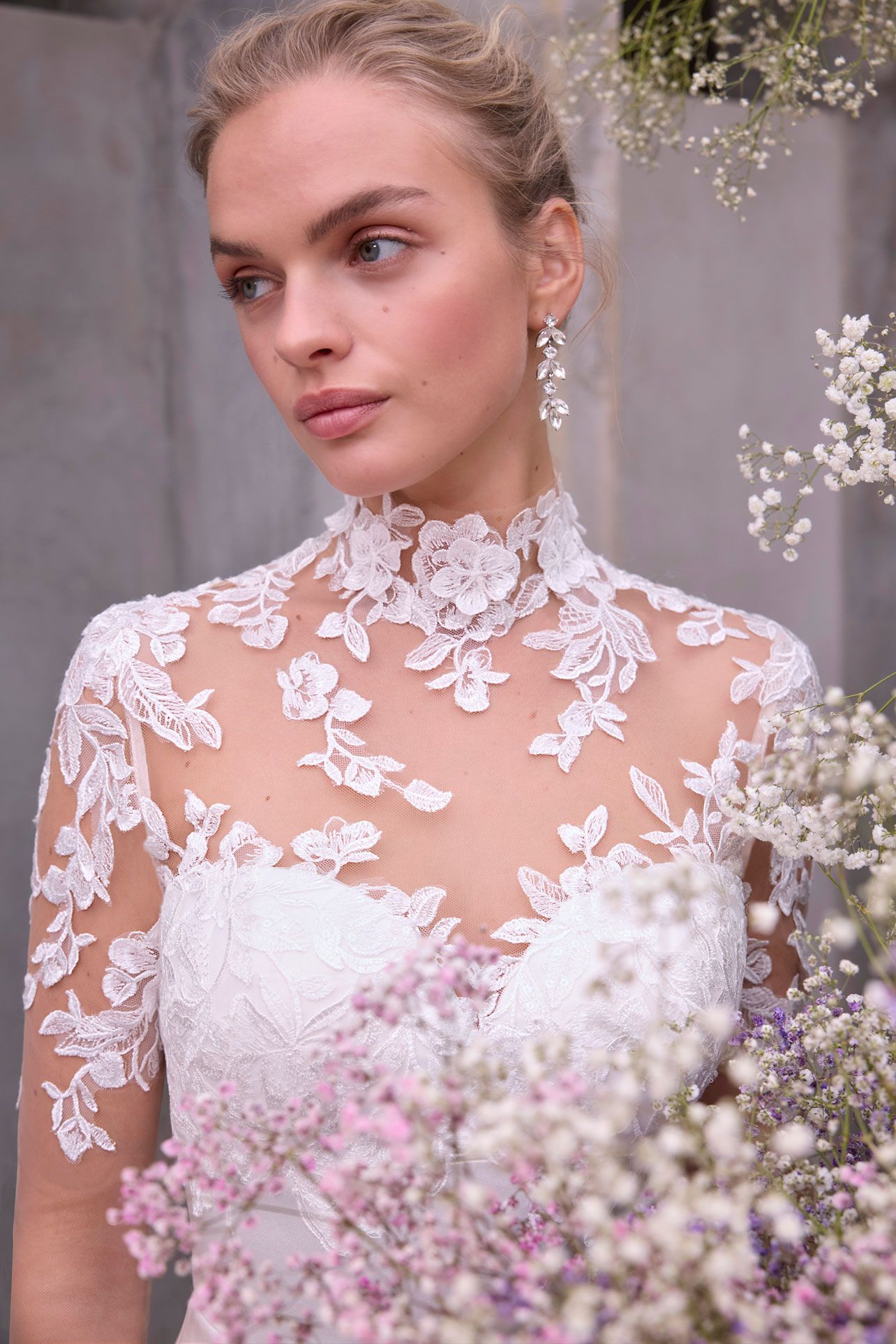 Questo abito da sposa a trapezio presenta un corpetto trasparente con applicazioni in pizzo floreale, maniche lunghe trasparenti e una scollatura a cuore su una gonna in raso.
