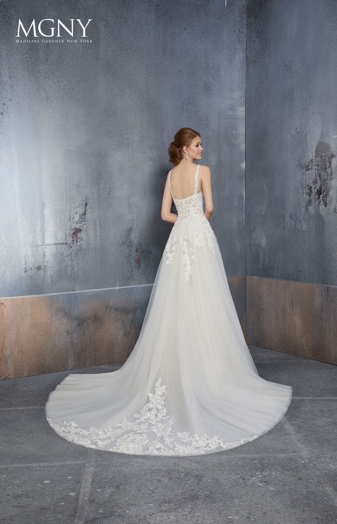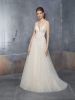 Abito da sposa scivolato caratterizzato da un corpetto con scollo a V definito da sottili bretelline bordate condelicate perline e strass. Il morbido tulle della gonna è arricchito da raffinate applicazioni in pizzo ricamate.