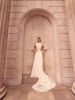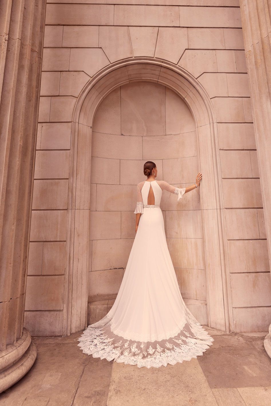 Questo abito dalla linea scivolata presenta molti elementi in stile boho che gli conferiscono un'aria davvero romantica. Realizzato in morbido e ondeggiante chiffon con corpetto in pizzo guipure e tulle a pois è rifinito da un bordo in pizzo geometrico. Girocollo di tendenza e divine maniche a campana si abbinano perfettamente al volume leggero della gonna che termina con uno spettacolare strascico in pizzo.