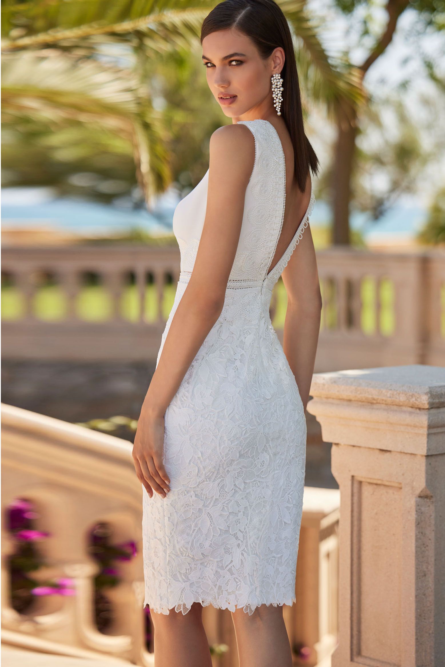 Questo abito da sposa corto, romantico ed elegante, è l'incarnazione di due abiti in uno. L'abito da sposa in pizzo e crêpe con profonda scollatura a V sulla schiena è caratterizzato da una sopragonna in crêpe staccabile che trasforma un abito sopra il ginocchio in un abito da sposa lungo a trapezio.