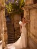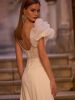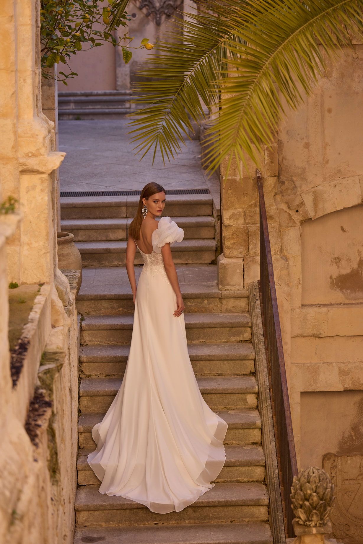 Abito da sposa scivolato in leggerissima organza con manica a palloncino staccabile. Il corpino, magnificamente ricamato, è caratterizzato dallo scollo a V e dal dettaglio della schiena scoperta con bottoni a vista.