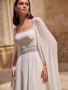 Raffinato abito da sposa in stile boho, in morbidissimo chiffon con maniche a mantella e dettagli in pizzo. Il corpetto è caratterizzato dall’elegante scollatura quadrata decorata con perline. Il punto vita è definito da un bordo in pizzo sapientemente ricamato.
