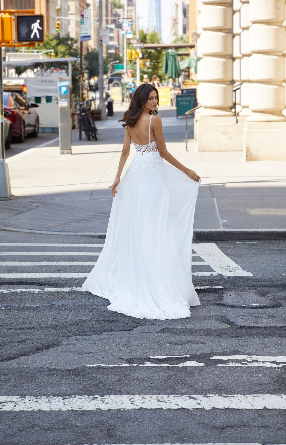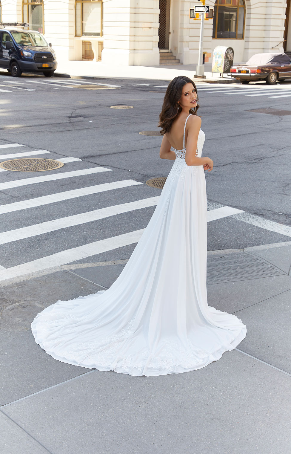 Un abito da sposa davvero dolce realizzato in morbido chiffon con corpetto in pizzo, definito da sottili bretelline ricamate con perline e un importante strascico. L'abito perfetto da abbinare ad accessori floreali e un look naturale.