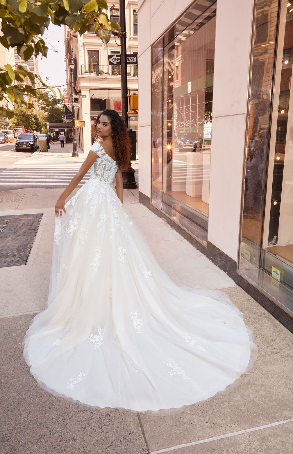 Un abito da sposa davvero romantico realizzato con ricchi ricami su una base di morbido tulle. Caratterizzato da moderno scollo a barchetta abbinato a una gonna a volume ampio è composta da strati di tulle in diverse finiture, che creano profondità e trasparenze. Un abito di cui sono fatti i sogni.
