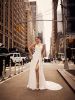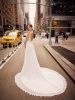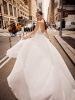 Abito svasato dalle linee impalpabili in morbido chiffon che si muove leggero, abbinato a un corpetto con sottili bretelline in pizzo, semplici decorazioni floreali e raffinata apertura sulla schiena. Un elegante strascico e un civettuolo spacco donano all’abito un look di assoluta tendenza.