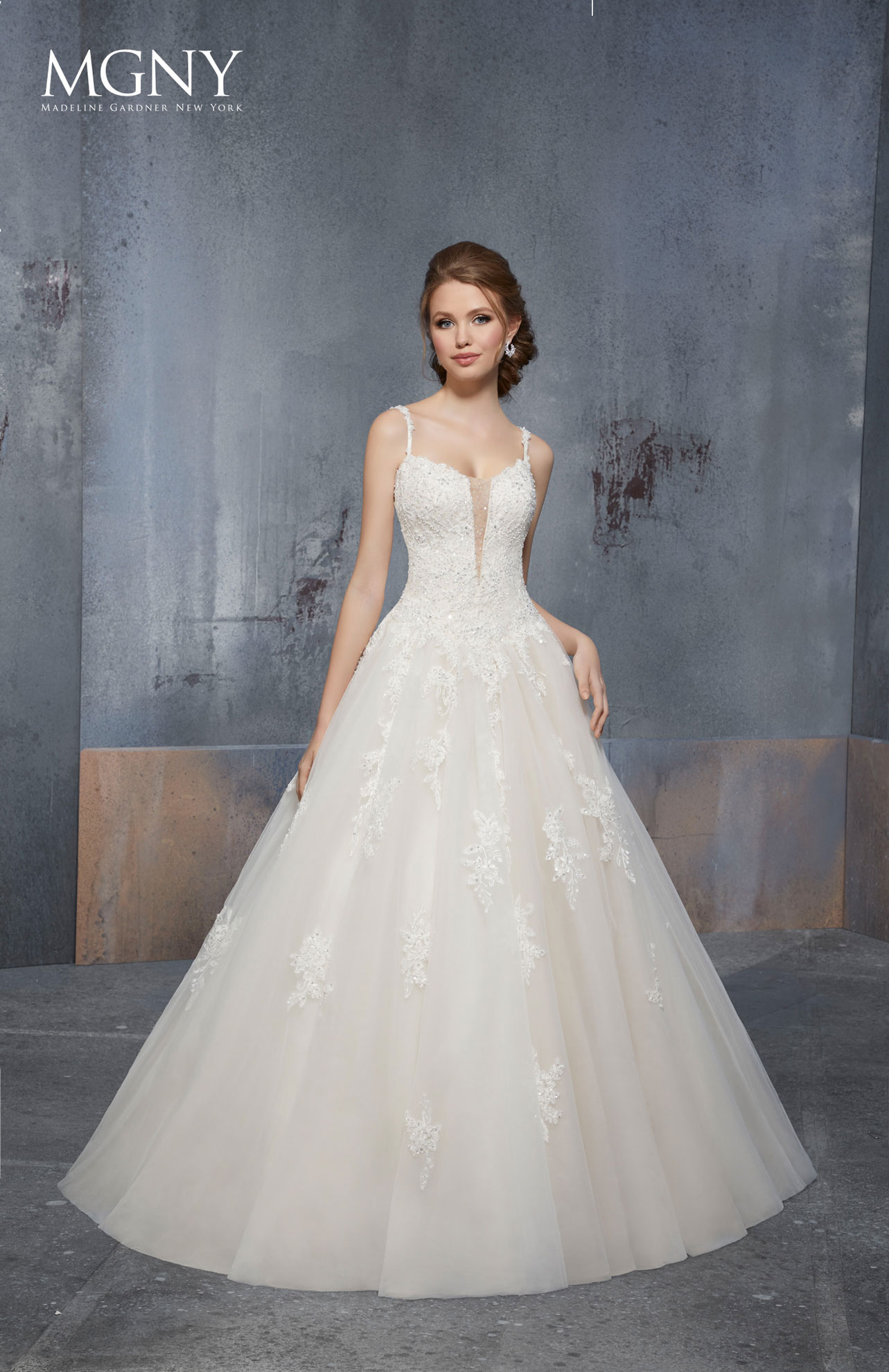 Cristalli luminosissimi e ricami con perline accentuano magnificamente il corpetto a V profonda di questo abito da sposa caratterizato da delicate spalline con perline e corpetto chantilly. La gonna di questo modello di abito da sposa è realizzata in tulle e organza glitterati che creano uno straordinario effetto scintillante.