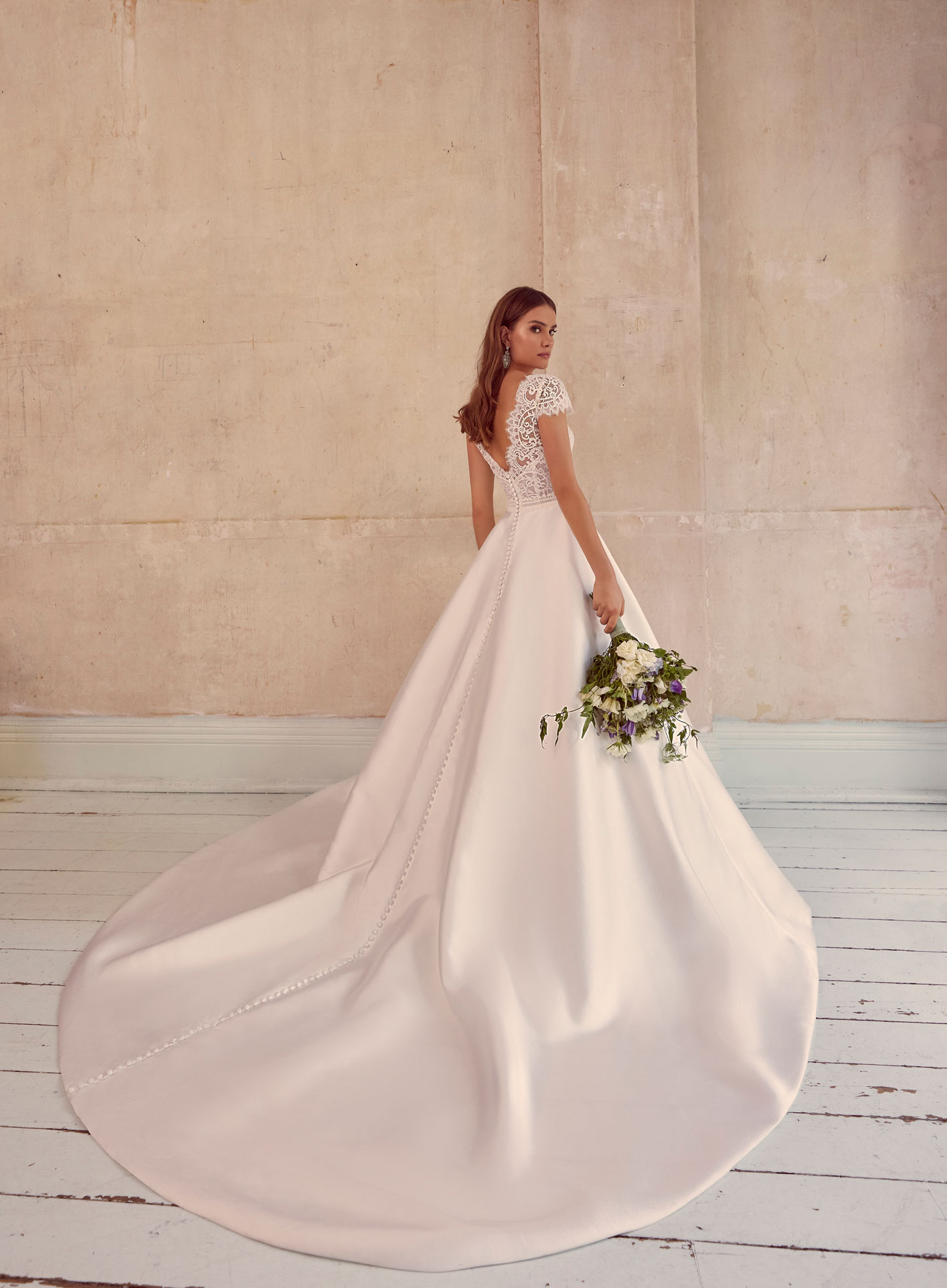 Favoloso abito da sposa in stile principessa realizzato in pizzo chantilly con scollatura all’americana di tulle brillante con numerosi punti luce in strass di ispirazione floreale che decorano il corpetto fino alla scollatura per esaltare il collo e le spalle.