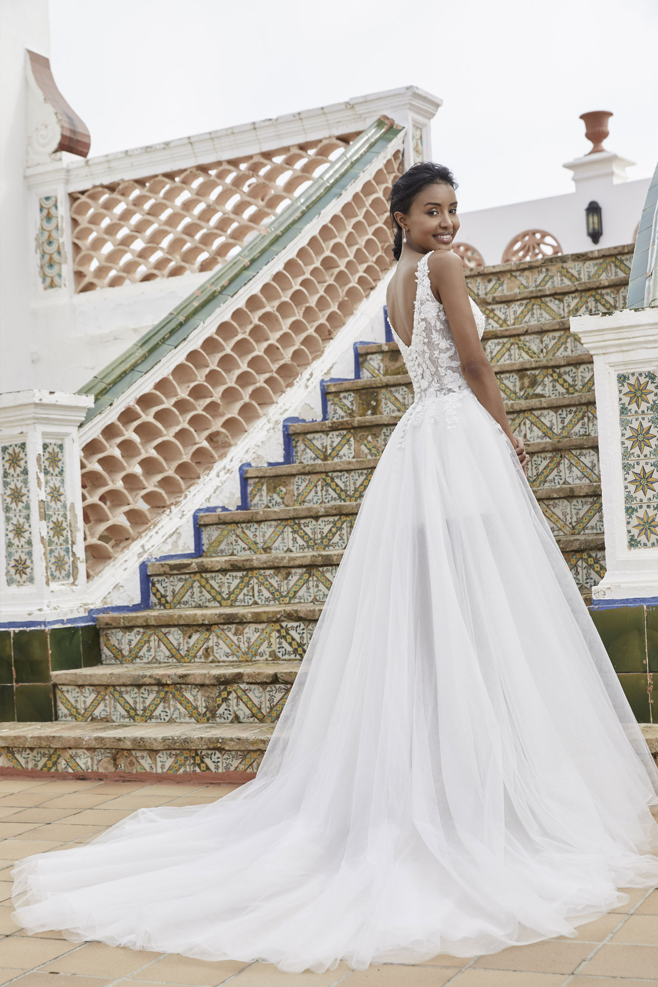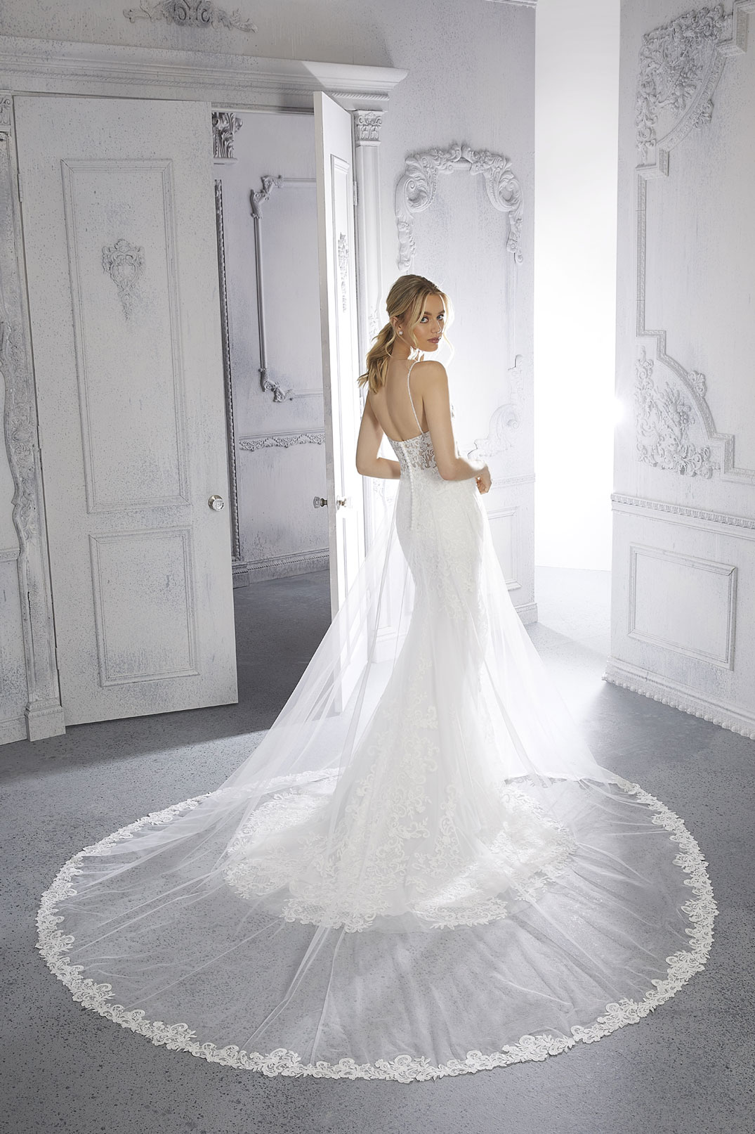 Il romanticismo del pizzo si esprime in tutta la sua meraviglia in questo stupendo abito da sposa a sirena con corpetto effetto bustier sapientemente lavorato con applicazioni floreali. Il modello è completato da sovragonna in tulle impalpabile rifinito da un delicato bordo in pizzo smerlato.