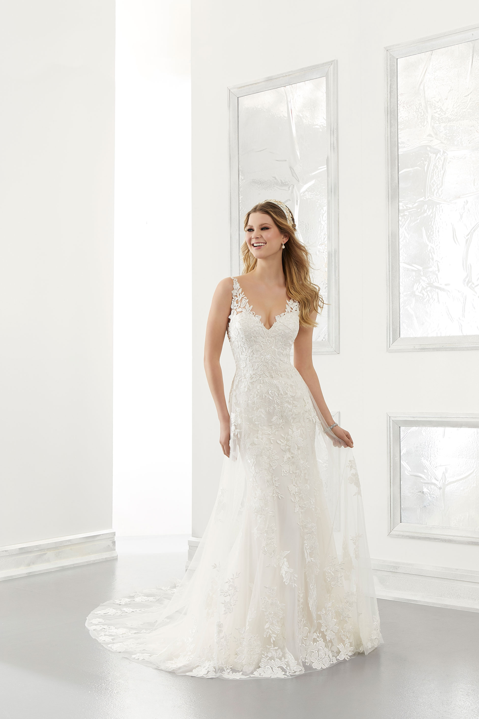 Un sofisticato scollo all'americana completa un classico abito da sposa scivolato in chiffon con un sensuale spacco frontale. Decori di perline di cristallo, una fila di bottoncini e spalline geometriche incorniciano e mettono magnificamente in risalto le spalle.