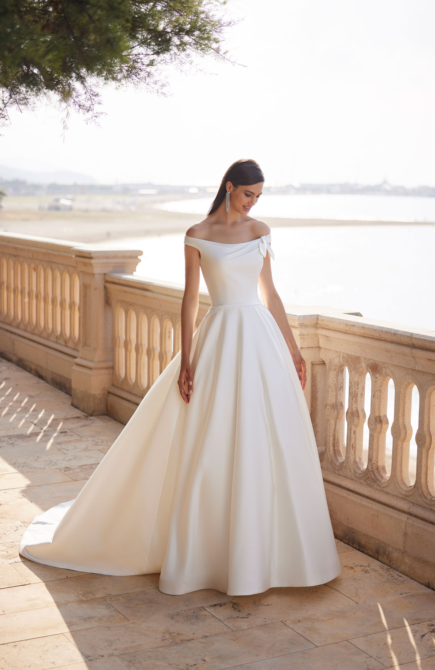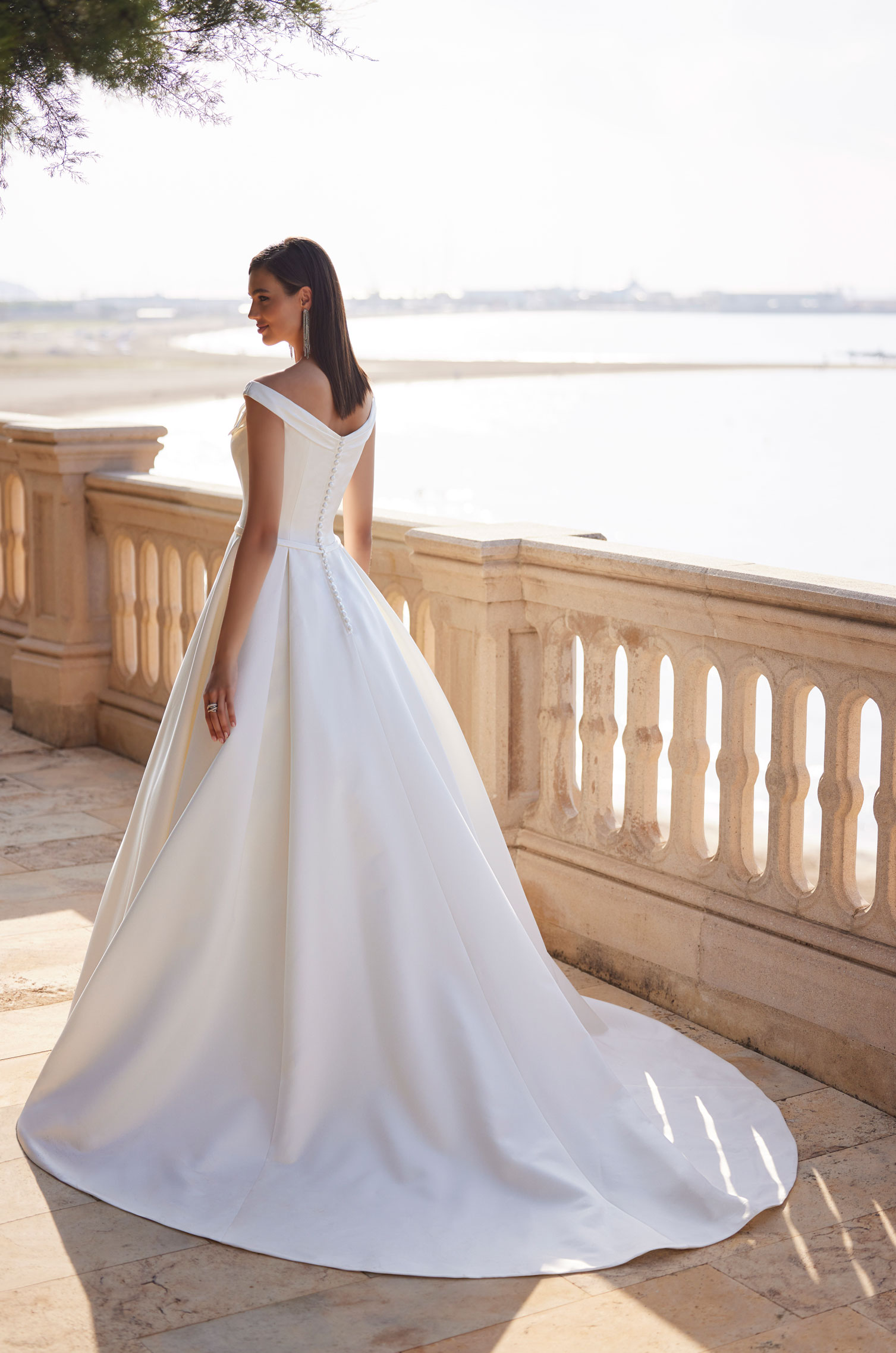 Splendido abito da sposa dalla personalità decisa con linee minimal, confezionato in mikado con ampia gonna a campana. Completano il look un sofisticato scollo all'americana decorato con cristalli luminosi, un fiocchetto a vita e una deliziosa fila di bottoncini che decora con grazia tutta la gonna fino allo strascico a cappella.