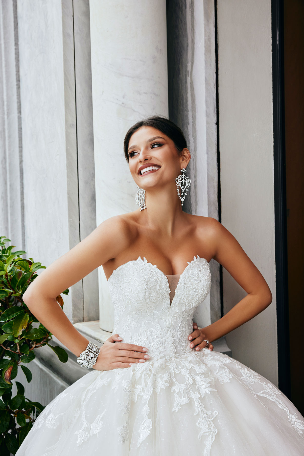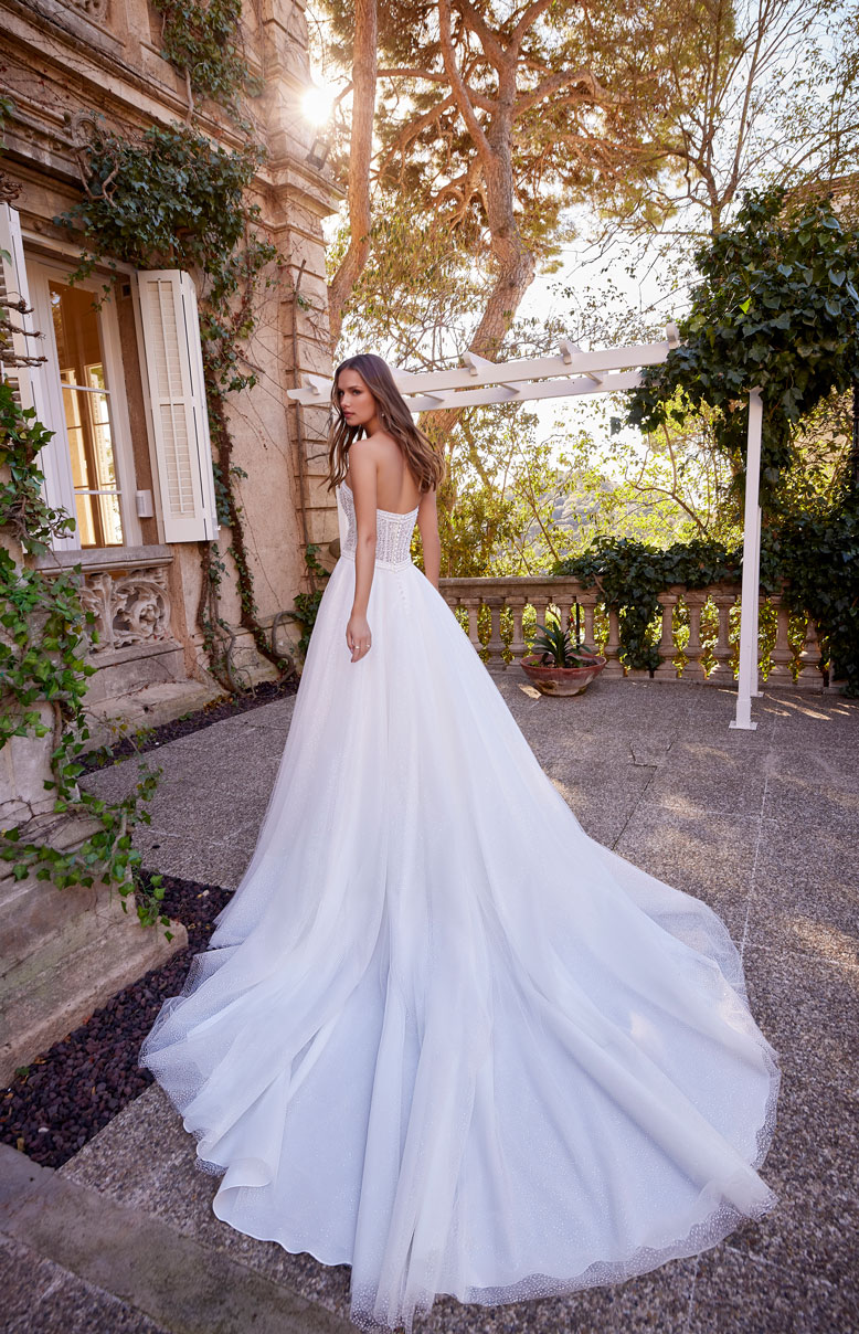 Abito da sposa scivolato in leggerissimo chiffon con maniche a mantella staccabili e dettagli in pizzo. Il corpino, magnificamente ricamato, è caratterizzato dallo scollo a barchetta e dal dettaglio della schiena trasparente con bottoni a vista che creano uno stile da sposa romantico.