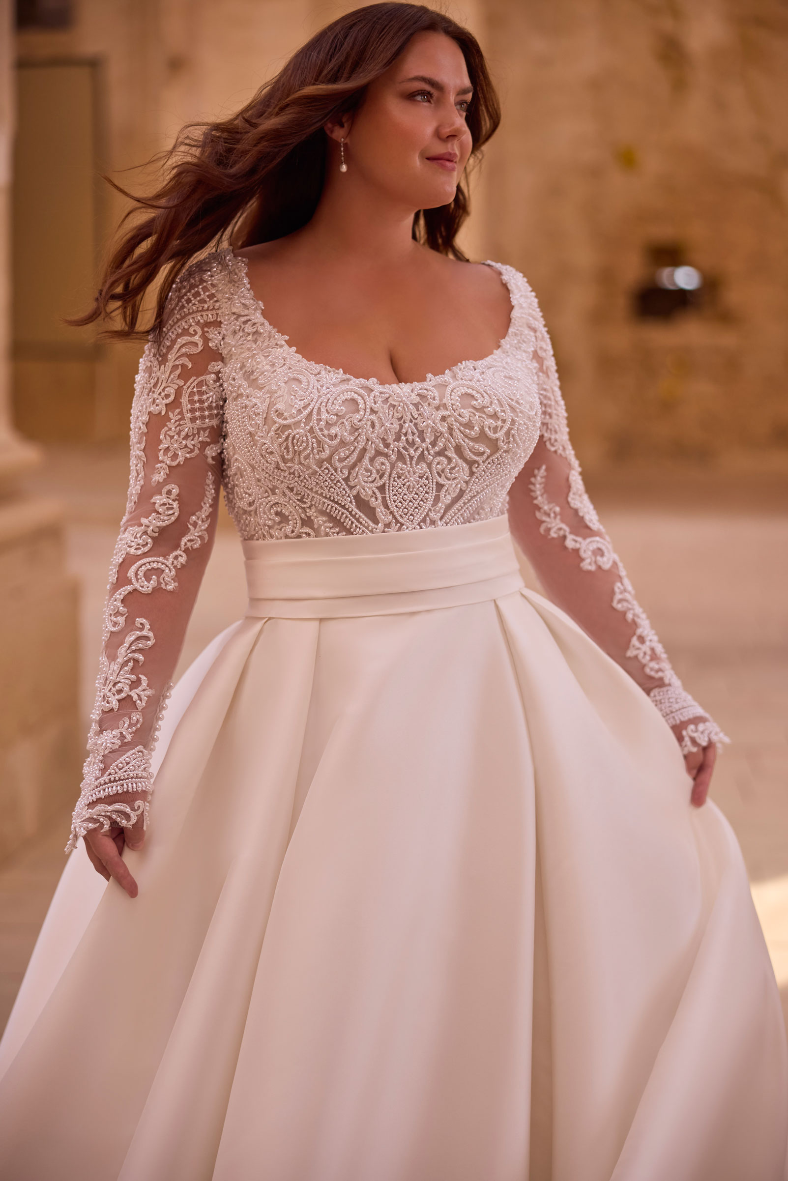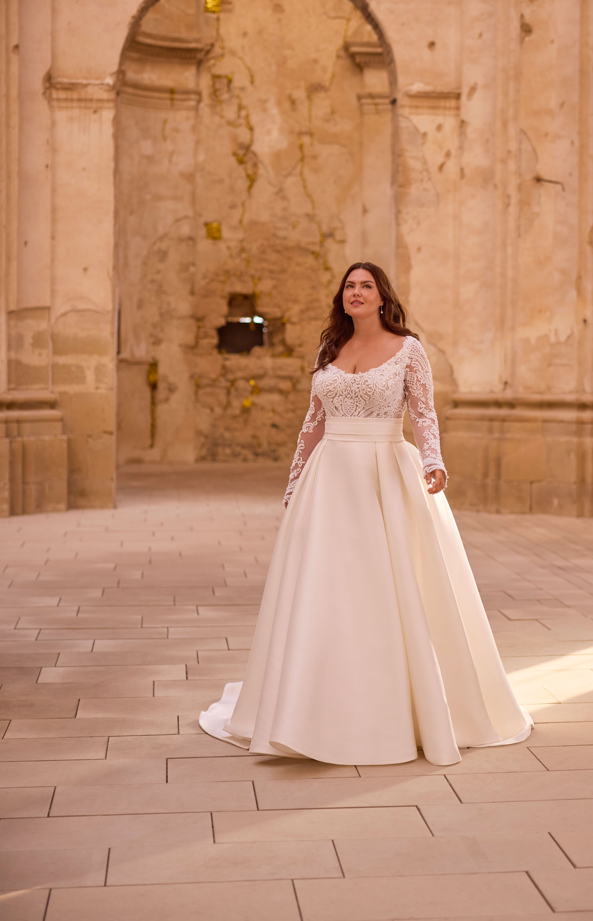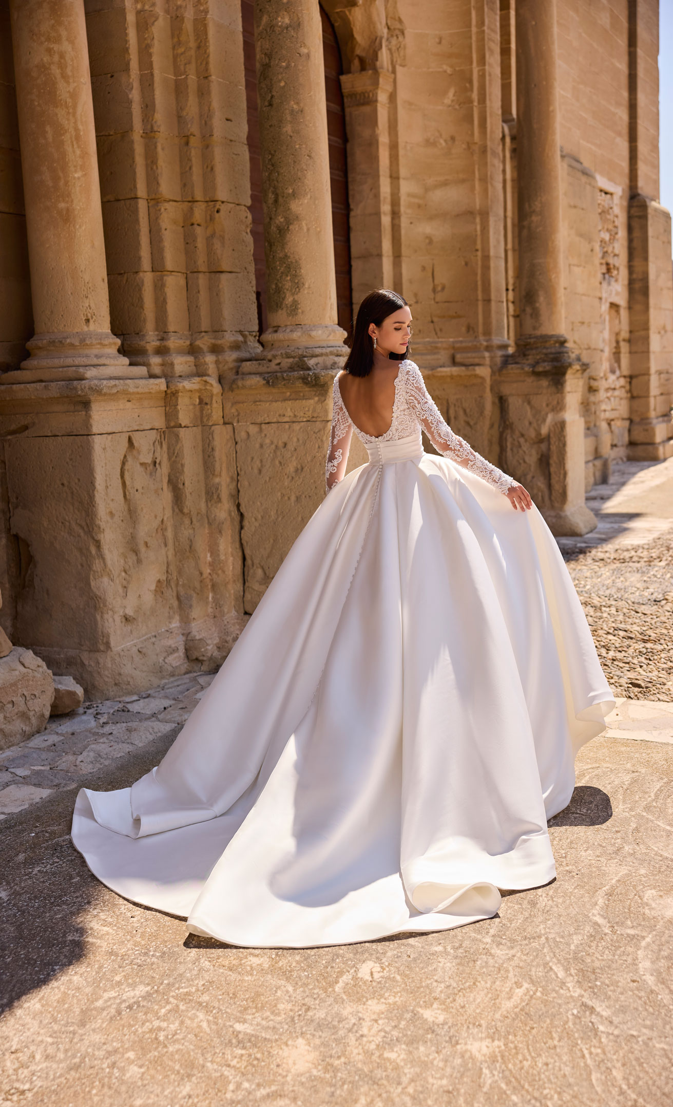 Abito sposa svasato dalle linee impalpabili in morbido chiffon che si muove leggero, abbinato a un corpetto con sottili bretelline ricamate e semplici decorazioni floreali e raffinata apertura sulla schiena. Un elegante strascico regale dona un tocco frizzante in più a un look romanitico e fresco.