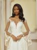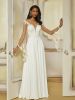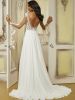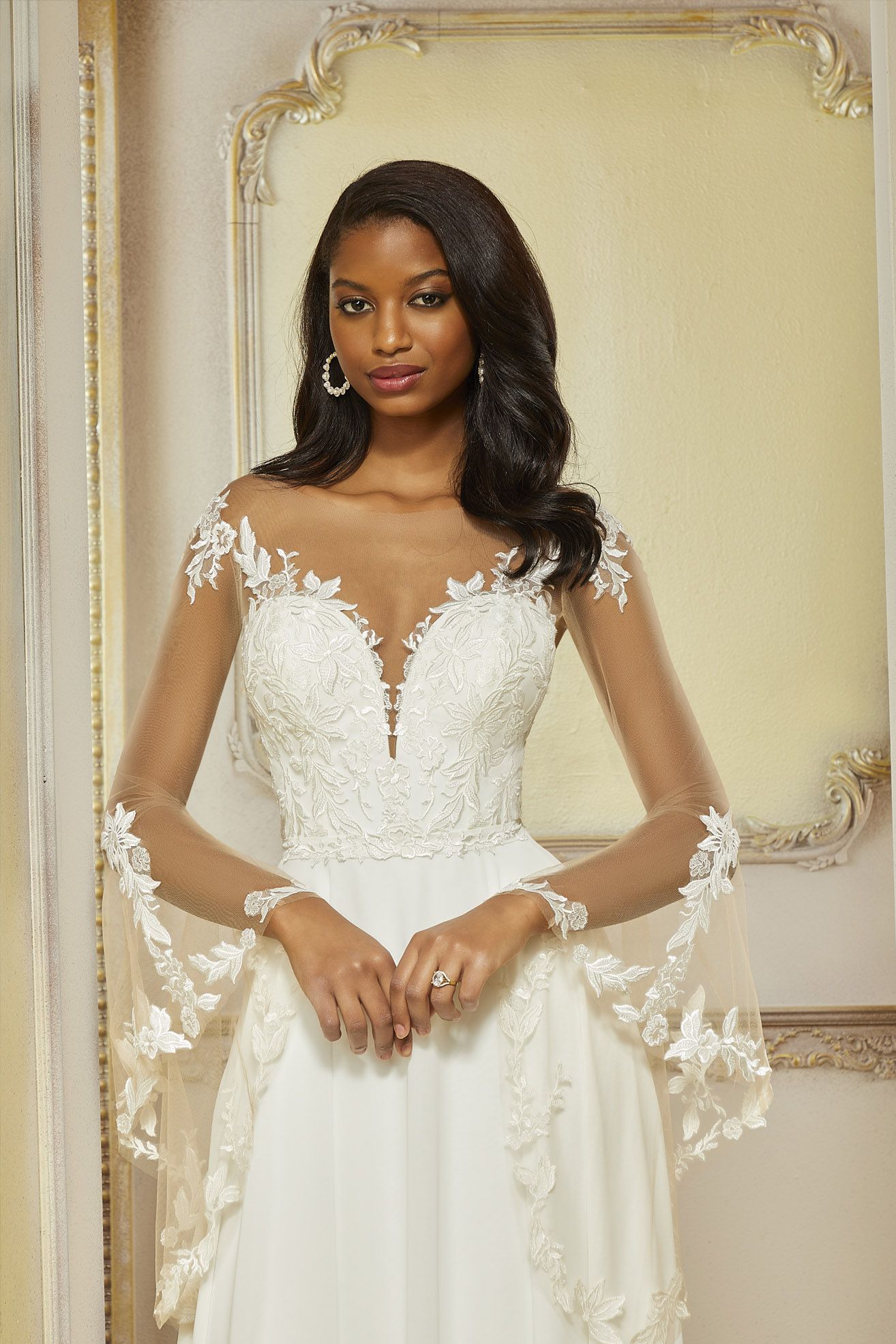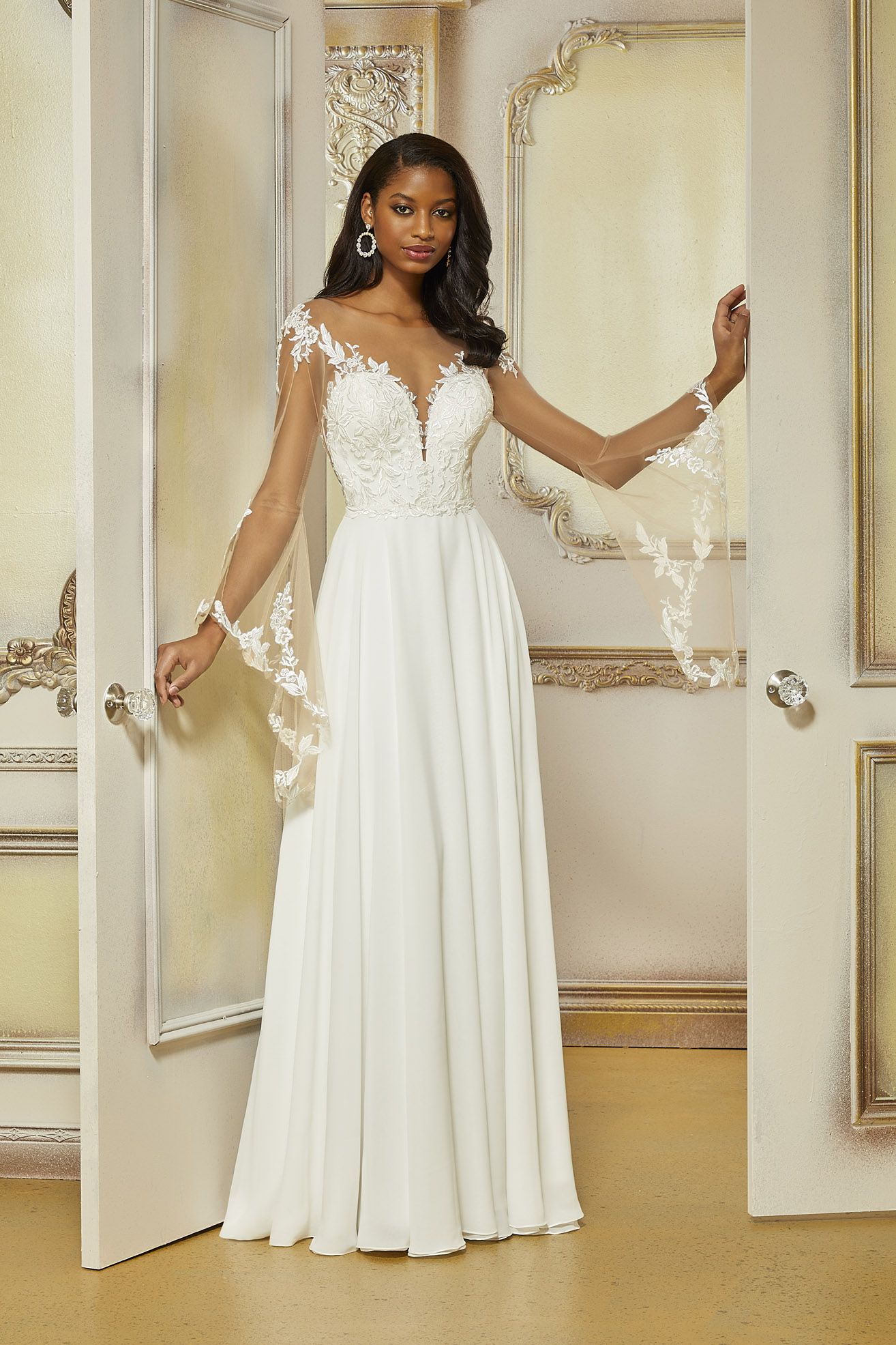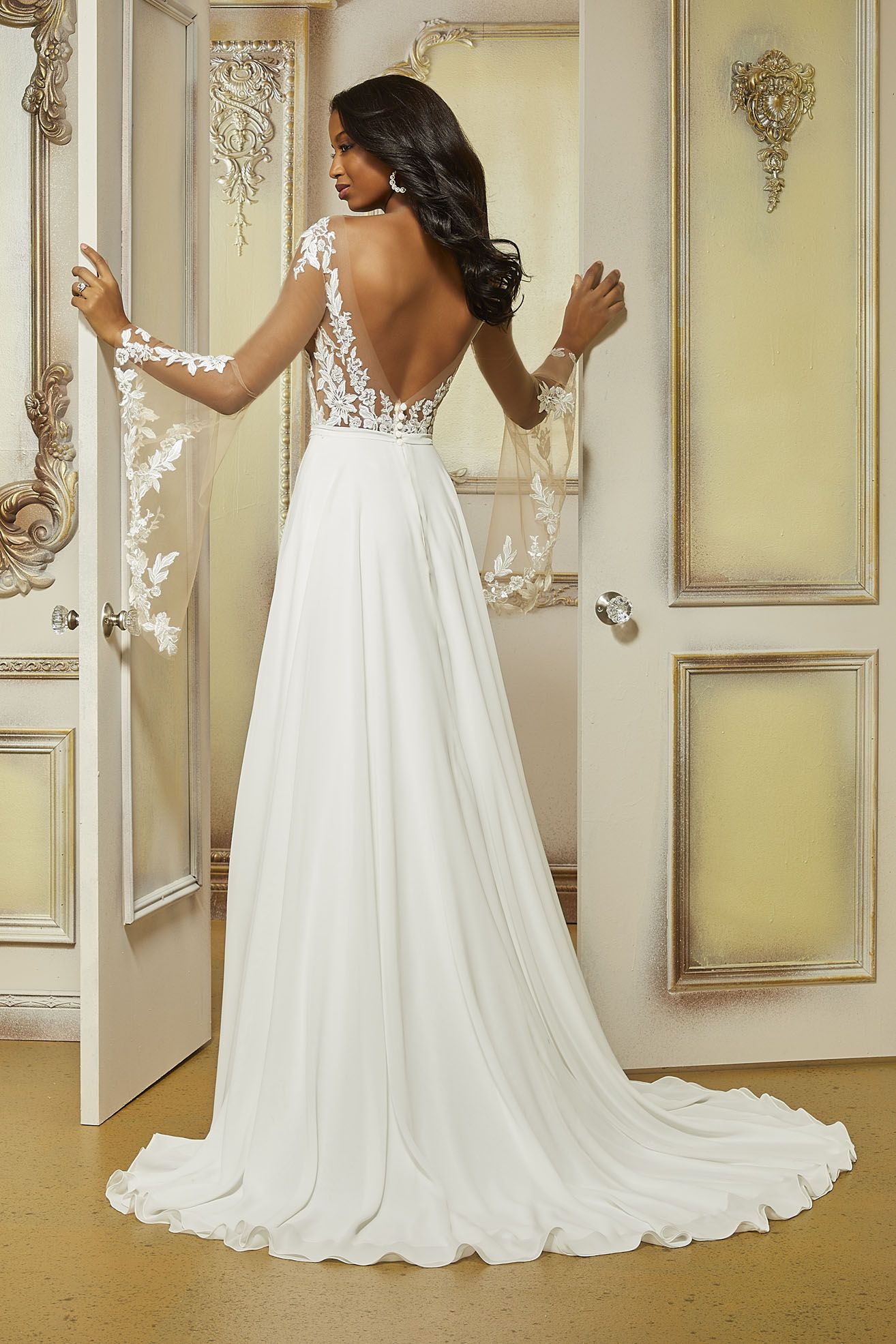 Abito da sposa svasato dalle linee impalpabili in morbido chiffon che si muove leggero, abbinato ad un corpetto con una semplice decorazione con fiori di campo e una profonda scollatura sulla schiena. Un elegante strascico e raffinate maniche a calla regalano un tocco romantico e frizzate allo stesso tempo.