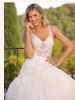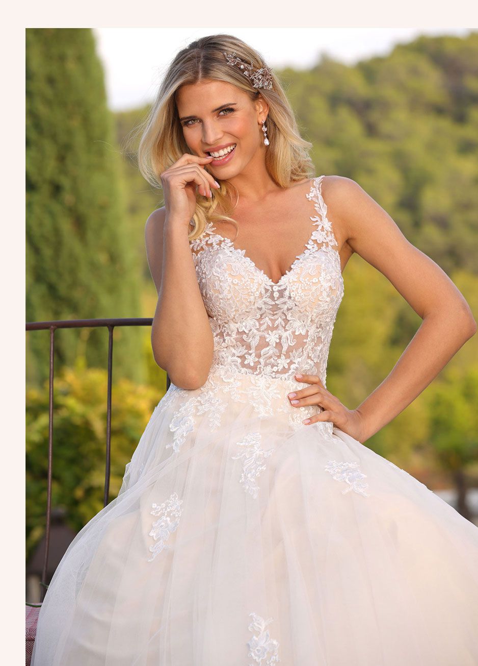 Abito da sposa per una vera principessa con elegante taglio svasato, gonna che gioca con sovrapposizioni di strati di tulle e pizzo ricamato e corpetto aderente in pizzo finissimo. Le maniche lunghe di tulle impalpabile decorate con applicazioni creano uno splendido effetto tattoo.