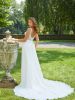 Meraviglioso abito da sposa realizzato in fluente chiffon. Un modello che combina la leggerezza della gonna con la sensualità delle trasparenze del corpetto decorato con abbaglianti ricami di perline di cristallo e sottili bretelle in pizzo che conferiscono alla schiena una giocosa e sensuale scollatura. Completa il look un profondo spacco sulla gonna con seducente effetto peek-a-boo.