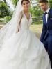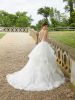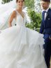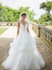 La cascata di balze di questo modello di abito da sposa aggiunge un tocco di delicato volume e femminilità ad una stupenda gonna in tulle glitterato, abbinata ad un corpetto con sensuale scollo a punta. Completa il look un delicato cinturino deliziosamente ricamato con perline e paillettes.