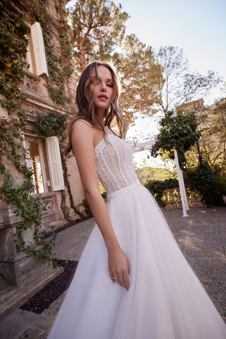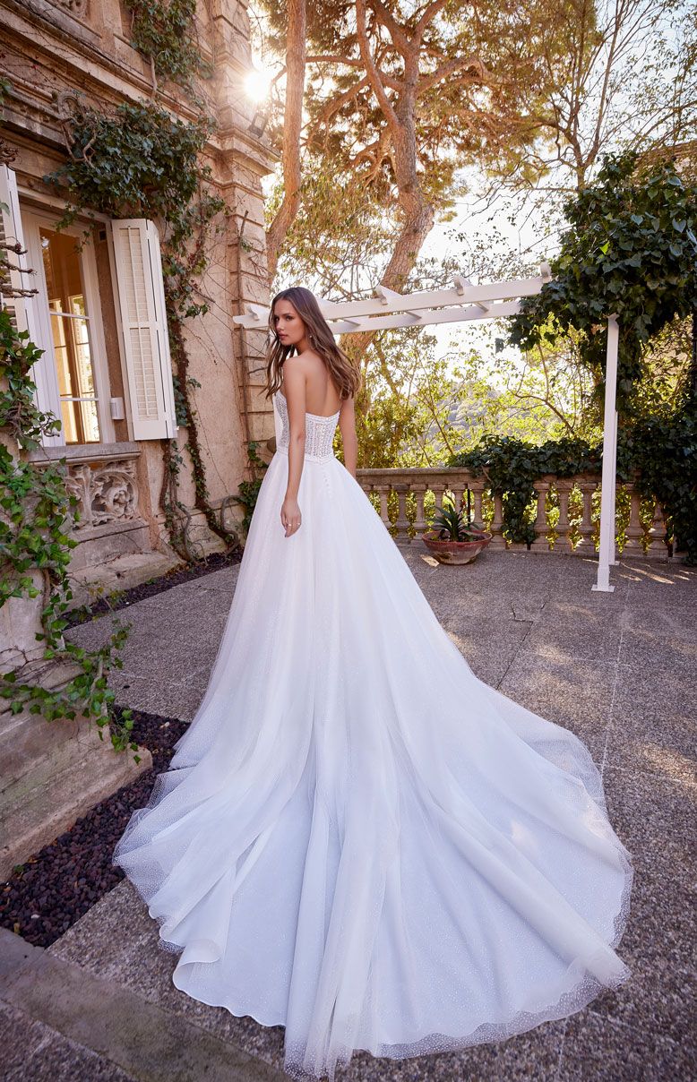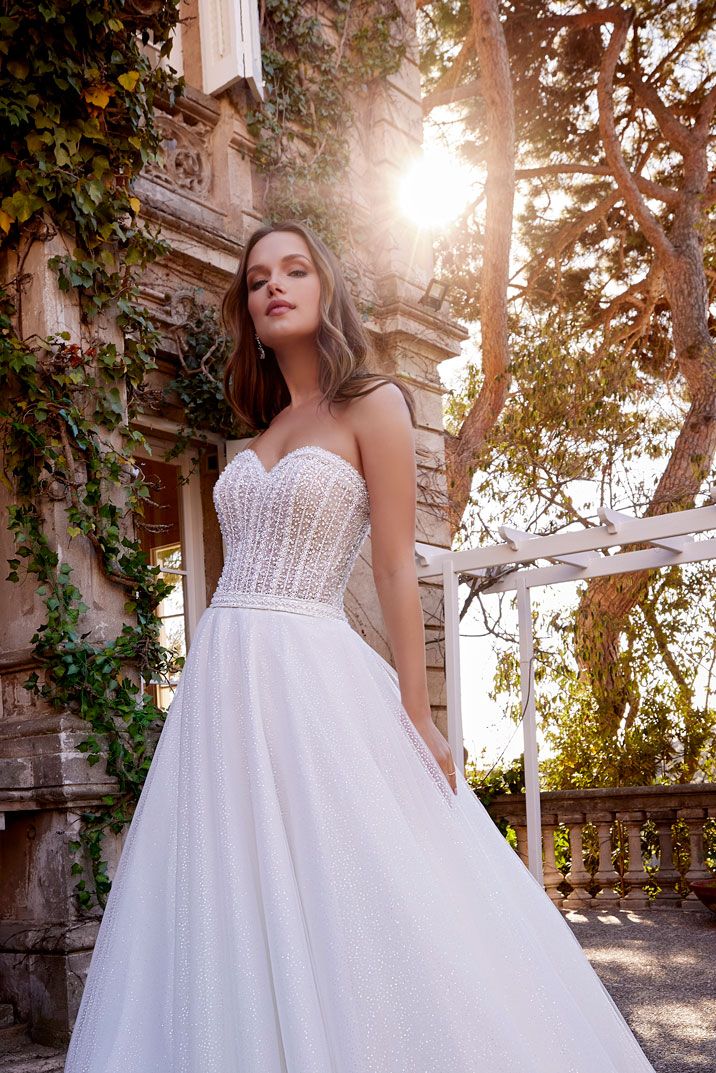 Questo sorprendente abito da sposa in stile principessa presenta un corpetto tempestato di cristalli luminosi e perle su una voluminosa gonna in morbido tulle e glitter che crea uno straordinario effetto brillante. Una delicata scollatura a cuore completa il look.