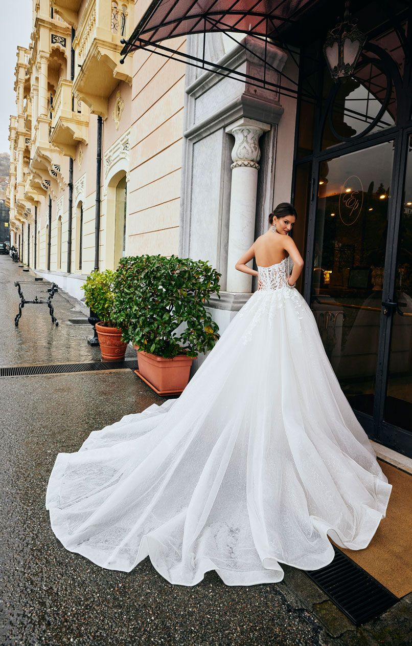 Romantico e sensuale, una rivisitazione moderna del classico abito da sposa. Il corpetto è caratterizzato da un'iconica scollatura a cuore e il meraviglioso pizzo di ispirazione floreale viene messo in risalto dalla preziosa organza della gonna. Un look totalmente etereo.