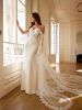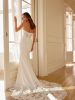 Questo abito da sposa dalla linea sirena, di ispirazione boho, è realizzato in crêpe ed è ornato da ricami floreali. Lo scollo frontale e la schiena estremamente sensuali sono formati da tulle e pizzo semi-trasparenti in stile corsetto, bottoncini e fiori 3D. Anche lo spettacolare strascico staccabile e le maniche a mantella a tutta lunghezza sono caratterizzato da ricami floreali.
