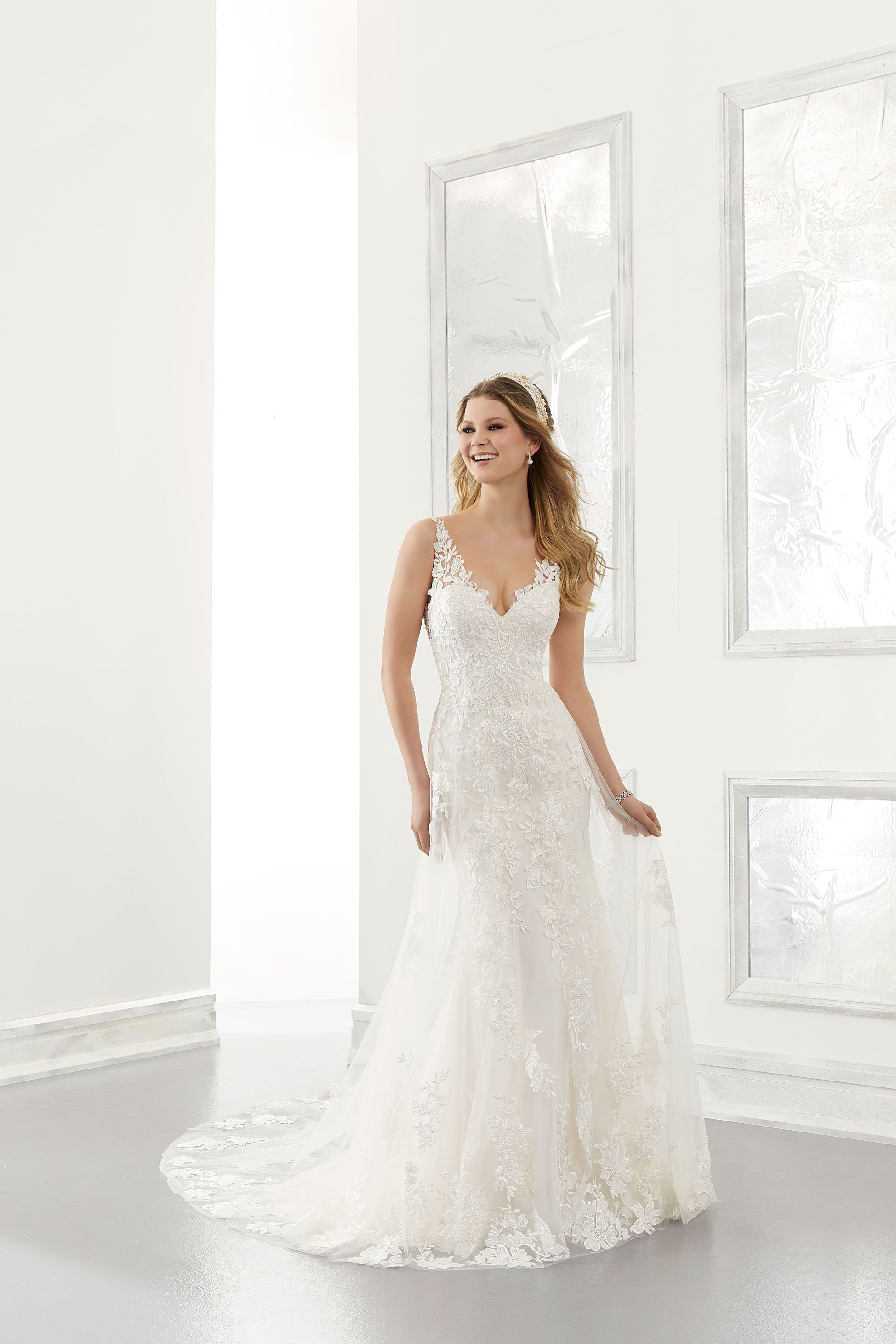 Un tradizionale abito in pizzo con un tocco moderno questo abito da sposa presenta una splendida scollatura a V definita da ricami floreali con effetto smerlato. Il taglio a sirena dell'abito è completamente realizzato in pizzo alençon. La sovragonna in tulle con applicazioni in pizzo forma un incantevole strascico trasparente a due strati che aggiunge movimento e volume.