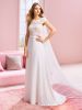 Questo raffinato abito da sposa colpisce per il grazioso corpetto in pizzo macramè accollato, con maniche ad aletta e strati di pizzo intrecciato, che sul punto vita si congiunge alla gonna in crêpe in corrispondenza di un grazioso fiocco.